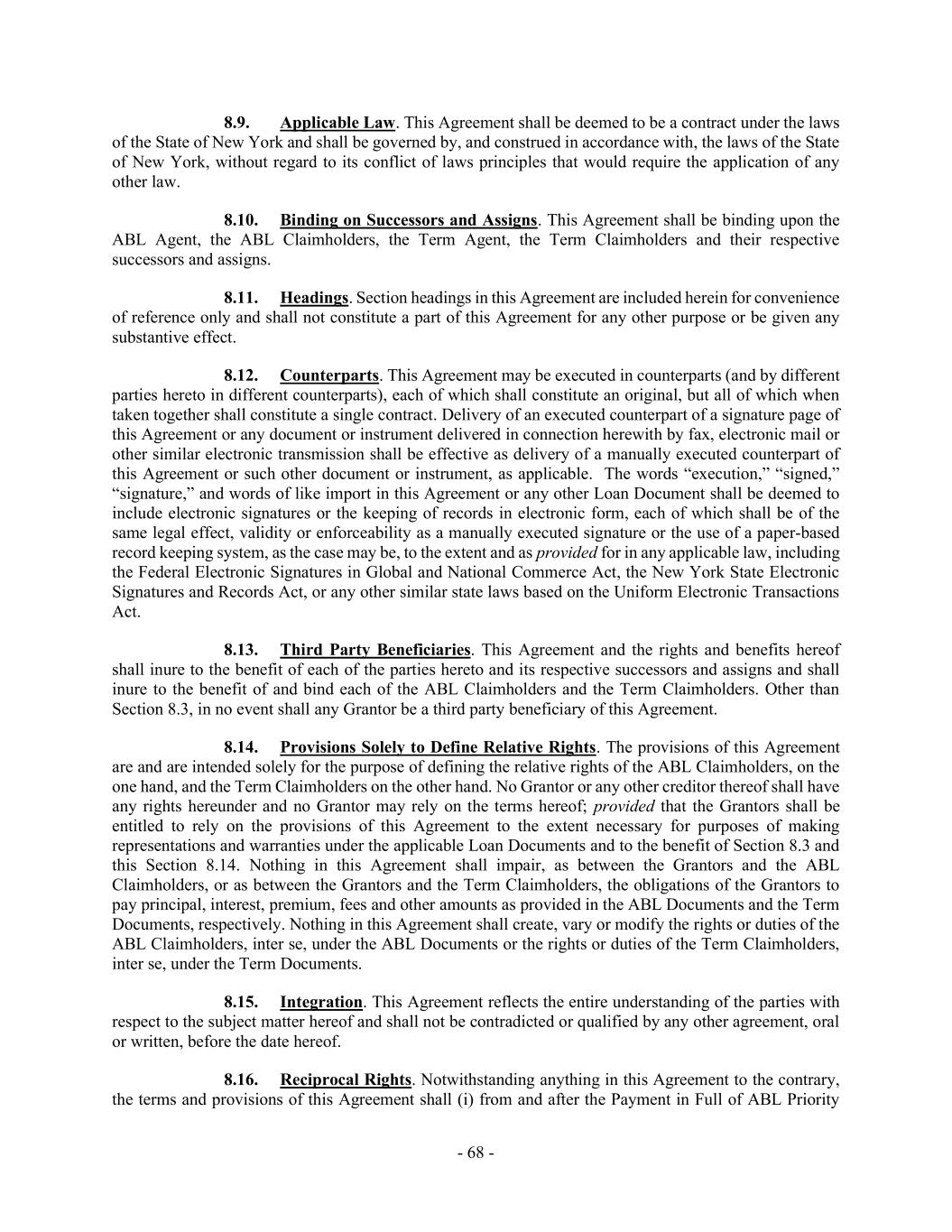 - 68 - 8.9. Applicable Law. This Agreement shall be deemed to be a contract under the laws of the State of New York and shall be governed by, and construed in accordance with, the laws of the State of New York, without regard to its conflict of laws principles that would require the application of any other law. 8.10. Binding on Successors and Assigns. This Agreement shall be binding upon the ABL Agent, the ABL Claimholders, the Term Agent, the Term Claimholders and their respective successors and assigns. 8.11. Headings. Section headings in this Agreement are included herein for convenience of reference only and shall not constitute a part of this Agreement for any other purpose or be given any substantive effect. 8.12. Counterparts. This Agreement may be executed in counterparts (and by different parties hereto in different counterparts), each of which shall constitute an original, but all of which when taken together shall constitute a single contract. Delivery of an executed counterpart of a signature page of this Agreement or any document or instrument delivered in connection herewith by fax, electronic mail or other similar electronic transmission shall be effective as delivery of a manually executed counterpart of this Agreement or such other document or instrument, as applicable. The words “execution,” “signed,” “signature,” and words of like import in this Agreement or any other Loan Document shall be deemed to include electronic signatures or the keeping of records in electronic form, each of which shall be of the same legal effect, validity or enforceability as a manually executed signature or the use of a paper-based record keeping system, as the case may be, to the extent and as provided for in any applicable law, including the Federal Electronic Signatures in Global and National Commerce Act, the New York State Electronic Signatures and Records Act, or any other similar state laws based on the Uniform Electronic Transactions Act. 8.13. Third Party Beneficiaries. This Agreement and the rights and benefits hereof shall inure to the benefit of each of the parties hereto and its respective successors and assigns and shall inure to the benefit of and bind each of the ABL Claimholders and the Term Claimholders. Other than Section 8.3, in no event shall any Grantor be a third party beneficiary of this Agreement. 8.14. Provisions Solely to Define Relative Rights. The provisions of this Agreement are and are intended solely for the purpose of defining the relative rights of the ABL Claimholders, on the one hand, and the Term Claimholders on the other hand. No Grantor or any other creditor thereof shall have any rights hereunder and no Grantor may rely on the terms hereof; provided that the Grantors shall be entitled to rely on the provisions of this Agreement to the extent necessary for purposes of making representations and warranties under the applicable Loan Documents and to the benefit of Section 8.3 and this Section 8.14. Nothing in this Agreement shall impair, as between the Grantors and the ABL Claimholders, or as between the Grantors and the Term Claimholders, the obligations of the Grantors to pay principal, interest, premium, fees and other amounts as provided in the ABL Documents and the Term Documents, respectively. Nothing in this Agreement shall create, vary or modify the rights or duties of the ABL Claimholders, inter se, under the ABL Documents or the rights or duties of the Term Claimholders, inter se, under the Term Documents. 8.15. Integration. This Agreement reflects the entire understanding of the parties with respect to the subject matter hereof and shall not be contradicted or qualified by any other agreement, oral or written, before the date hereof. 8.16. Reciprocal Rights. Notwithstanding anything in this Agreement to the contrary, the terms and provisions of this Agreement shall (i) from and after the Payment in Full of ABL Priority