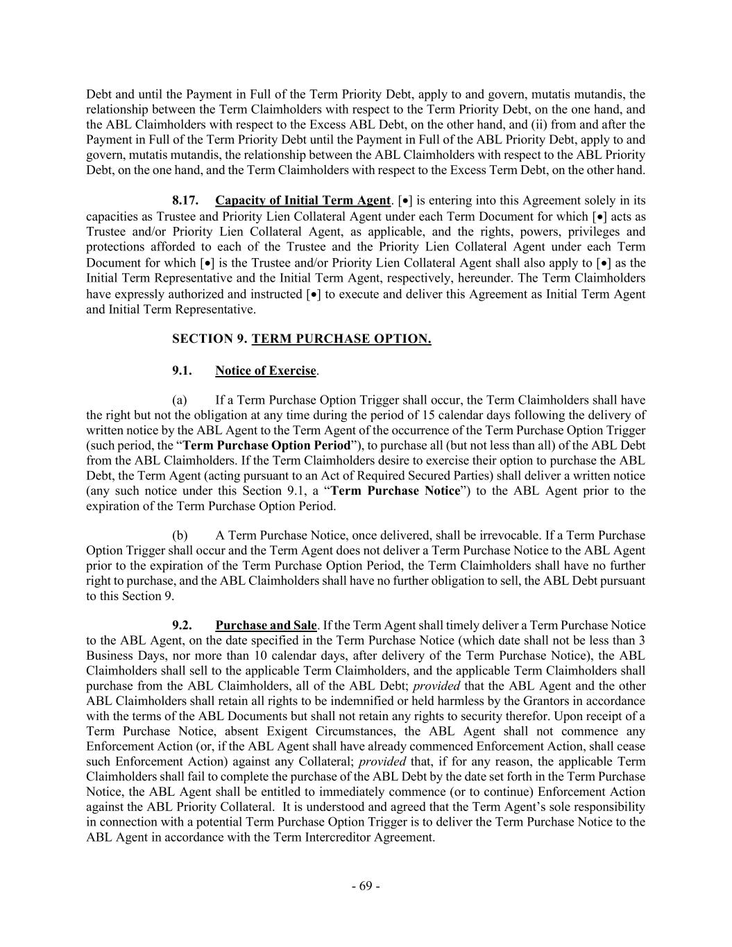 - 69 - Debt and until the Payment in Full of the Term Priority Debt, apply to and govern, mutatis mutandis, the relationship between the Term Claimholders with respect to the Term Priority Debt, on the one hand, and the ABL Claimholders with respect to the Excess ABL Debt, on the other hand, and (ii) from and after the Payment in Full of the Term Priority Debt until the Payment in Full of the ABL Priority Debt, apply to and govern, mutatis mutandis, the relationship between the ABL Claimholders with respect to the ABL Priority Debt, on the one hand, and the Term Claimholders with respect to the Excess Term Debt, on the other hand. 8.17. Capacity of Initial Term Agent. [] is entering into this Agreement solely in its capacities as Trustee and Priority Lien Collateral Agent under each Term Document for which [] acts as Trustee and/or Priority Lien Collateral Agent, as applicable, and the rights, powers, privileges and protections afforded to each of the Trustee and the Priority Lien Collateral Agent under each Term Document for which [] is the Trustee and/or Priority Lien Collateral Agent shall also apply to [] as the Initial Term Representative and the Initial Term Agent, respectively, hereunder. The Term Claimholders have expressly authorized and instructed [] to execute and deliver this Agreement as Initial Term Agent and Initial Term Representative. SECTION 9. TERM PURCHASE OPTION. 9.1. Notice of Exercise. (a) If a Term Purchase Option Trigger shall occur, the Term Claimholders shall have the right but not the obligation at any time during the period of 15 calendar days following the delivery of written notice by the ABL Agent to the Term Agent of the occurrence of the Term Purchase Option Trigger (such period, the “Term Purchase Option Period”), to purchase all (but not less than all) of the ABL Debt from the ABL Claimholders. If the Term Claimholders desire to exercise their option to purchase the ABL Debt, the Term Agent (acting pursuant to an Act of Required Secured Parties) shall deliver a written notice (any such notice under this Section 9.1, a “Term Purchase Notice”) to the ABL Agent prior to the expiration of the Term Purchase Option Period. (b) A Term Purchase Notice, once delivered, shall be irrevocable. If a Term Purchase Option Trigger shall occur and the Term Agent does not deliver a Term Purchase Notice to the ABL Agent prior to the expiration of the Term Purchase Option Period, the Term Claimholders shall have no further right to purchase, and the ABL Claimholders shall have no further obligation to sell, the ABL Debt pursuant to this Section 9. 9.2. Purchase and Sale. If the Term Agent shall timely deliver a Term Purchase Notice to the ABL Agent, on the date specified in the Term Purchase Notice (which date shall not be less than 3 Business Days, nor more than 10 calendar days, after delivery of the Term Purchase Notice), the ABL Claimholders shall sell to the applicable Term Claimholders, and the applicable Term Claimholders shall purchase from the ABL Claimholders, all of the ABL Debt; provided that the ABL Agent and the other ABL Claimholders shall retain all rights to be indemnified or held harmless by the Grantors in accordance with the terms of the ABL Documents but shall not retain any rights to security therefor. Upon receipt of a Term Purchase Notice, absent Exigent Circumstances, the ABL Agent shall not commence any Enforcement Action (or, if the ABL Agent shall have already commenced Enforcement Action, shall cease such Enforcement Action) against any Collateral; provided that, if for any reason, the applicable Term Claimholders shall fail to complete the purchase of the ABL Debt by the date set forth in the Term Purchase Notice, the ABL Agent shall be entitled to immediately commence (or to continue) Enforcement Action against the ABL Priority Collateral. It is understood and agreed that the Term Agent’s sole responsibility in connection with a potential Term Purchase Option Trigger is to deliver the Term Purchase Notice to the ABL Agent in accordance with the Term Intercreditor Agreement.