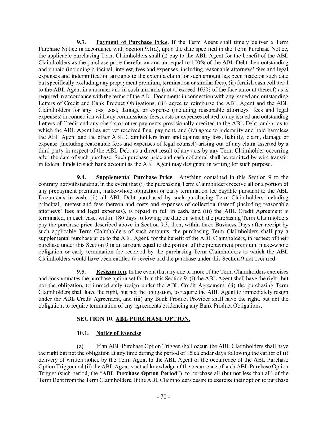 - 70 - 9.3. Payment of Purchase Price. If the Term Agent shall timely deliver a Term Purchase Notice in accordance with Section 9.1(a), upon the date specified in the Term Purchase Notice, the applicable purchasing Term Claimholders shall (i) pay to the ABL Agent for the benefit of the ABL Claimholders as the purchase price therefor an amount equal to 100% of the ABL Debt then outstanding and unpaid (including principal, interest, fees and expenses, including reasonable attorneys’ fees and legal expenses and indemnification amounts to the extent a claim for such amount has been made on such date but specifically excluding any prepayment premium, termination or similar fees), (ii) furnish cash collateral to the ABL Agent in a manner and in such amounts (not to exceed 103% of the face amount thereof) as is required in accordance with the terms of the ABL Documents in connection with any issued and outstanding Letters of Credit and Bank Product Obligations, (iii) agree to reimburse the ABL Agent and the ABL Claimholders for any loss, cost, damage or expense (including reasonable attorneys’ fees and legal expenses) in connection with any commissions, fees, costs or expenses related to any issued and outstanding Letters of Credit and any checks or other payments provisionally credited to the ABL Debt, and/or as to which the ABL Agent has not yet received final payment, and (iv) agree to indemnify and hold harmless the ABL Agent and the other ABL Claimholders from and against any loss, liability, claim, damage or expense (including reasonable fees and expenses of legal counsel) arising out of any claim asserted by a third party in respect of the ABL Debt as a direct result of any acts by any Term Claimholder occurring after the date of such purchase. Such purchase price and cash collateral shall be remitted by wire transfer in federal funds to such bank account as the ABL Agent may designate in writing for such purpose. 9.4. Supplemental Purchase Price. Anything contained in this Section 9 to the contrary notwithstanding, in the event that (i) the purchasing Term Claimholders receive all or a portion of any prepayment premium, make-whole obligation or early termination fee payable pursuant to the ABL Documents in cash, (ii) all ABL Debt purchased by such purchasing Term Claimholders including principal, interest and fees thereon and costs and expenses of collection thereof (including reasonable attorneys’ fees and legal expenses), is repaid in full in cash, and (iii) the ABL Credit Agreement is terminated, in each case, within 180 days following the date on which the purchasing Term Claimholders pay the purchase price described above in Section 9.3, then, within three Business Days after receipt by such applicable Term Claimholders of such amounts, the purchasing Term Claimholders shall pay a supplemental purchase price to the ABL Agent, for the benefit of the ABL Claimholders, in respect of their purchase under this Section 9 in an amount equal to the portion of the prepayment premium, make-whole obligation or early termination fee received by the purchasing Term Claimholders to which the ABL Claimholders would have been entitled to receive had the purchase under this Section 9 not occurred. 9.5. Resignation. In the event that any one or more of the Term Claimholders exercises and consummates the purchase option set forth in this Section 9, (i) the ABL Agent shall have the right, but not the obligation, to immediately resign under the ABL Credit Agreement, (ii) the purchasing Term Claimholders shall have the right, but not the obligation, to require the ABL Agent to immediately resign under the ABL Credit Agreement, and (iii) any Bank Product Provider shall have the right, but not the obligation, to require termination of any agreements evidencing any Bank Product Obligations. SECTION 10. ABL PURCHASE OPTION. 10.1. Notice of Exercise. (a) If an ABL Purchase Option Trigger shall occur, the ABL Claimholders shall have the right but not the obligation at any time during the period of 15 calendar days following the earlier of (i) delivery of written notice by the Term Agent to the ABL Agent of the occurrence of the ABL Purchase Option Trigger and (ii) the ABL Agent’s actual knowledge of the occurrence of such ABL Purchase Option Trigger (such period, the “ABL Purchase Option Period”), to purchase all (but not less than all) of the Term Debt from the Term Claimholders. If the ABL Claimholders desire to exercise their option to purchase