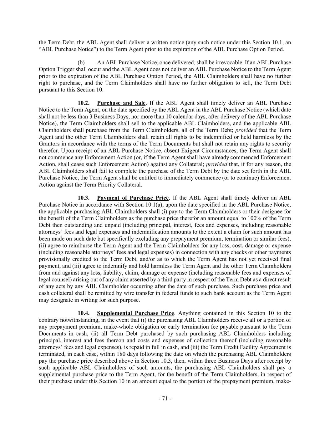 - 71 - the Term Debt, the ABL Agent shall deliver a written notice (any such notice under this Section 10.1, an “ABL Purchase Notice”) to the Term Agent prior to the expiration of the ABL Purchase Option Period. (b) An ABL Purchase Notice, once delivered, shall be irrevocable. If an ABL Purchase Option Trigger shall occur and the ABL Agent does not deliver an ABL Purchase Notice to the Term Agent prior to the expiration of the ABL Purchase Option Period, the ABL Claimholders shall have no further right to purchase, and the Term Claimholders shall have no further obligation to sell, the Term Debt pursuant to this Section 10. 10.2. Purchase and Sale. If the ABL Agent shall timely deliver an ABL Purchase Notice to the Term Agent, on the date specified by the ABL Agent in the ABL Purchase Notice (which date shall not be less than 3 Business Days, nor more than 10 calendar days, after delivery of the ABL Purchase Notice), the Term Claimholders shall sell to the applicable ABL Claimholders, and the applicable ABL Claimholders shall purchase from the Term Claimholders, all of the Term Debt; provided that the Term Agent and the other Term Claimholders shall retain all rights to be indemnified or held harmless by the Grantors in accordance with the terms of the Term Documents but shall not retain any rights to security therefor. Upon receipt of an ABL Purchase Notice, absent Exigent Circumstances, the Term Agent shall not commence any Enforcement Action (or, if the Term Agent shall have already commenced Enforcement Action, shall cease such Enforcement Action) against any Collateral; provided that, if for any reason, the ABL Claimholders shall fail to complete the purchase of the Term Debt by the date set forth in the ABL Purchase Notice, the Term Agent shall be entitled to immediately commence (or to continue) Enforcement Action against the Term Priority Collateral. 10.3. Payment of Purchase Price. If the ABL Agent shall timely deliver an ABL Purchase Notice in accordance with Section 10.1(a), upon the date specified in the ABL Purchase Notice, the applicable purchasing ABL Claimholders shall (i) pay to the Term Claimholders or their designee for the benefit of the Term Claimholders as the purchase price therefor an amount equal to 100% of the Term Debt then outstanding and unpaid (including principal, interest, fees and expenses, including reasonable attorneys’ fees and legal expenses and indemnification amounts to the extent a claim for such amount has been made on such date but specifically excluding any prepayment premium, termination or similar fees), (ii) agree to reimburse the Term Agent and the Term Claimholders for any loss, cost, damage or expense (including reasonable attorneys’ fees and legal expenses) in connection with any checks or other payments provisionally credited to the Term Debt, and/or as to which the Term Agent has not yet received final payment, and (iii) agree to indemnify and hold harmless the Term Agent and the other Term Claimholders from and against any loss, liability, claim, damage or expense (including reasonable fees and expenses of legal counsel) arising out of any claim asserted by a third party in respect of the Term Debt as a direct result of any acts by any ABL Claimholder occurring after the date of such purchase. Such purchase price and cash collateral shall be remitted by wire transfer in federal funds to such bank account as the Term Agent may designate in writing for such purpose. 10.4. Supplemental Purchase Price. Anything contained in this Section 10 to the contrary notwithstanding, in the event that (i) the purchasing ABL Claimholders receive all or a portion of any prepayment premium, make-whole obligation or early termination fee payable pursuant to the Term Documents in cash, (ii) all Term Debt purchased by such purchasing ABL Claimholders including principal, interest and fees thereon and costs and expenses of collection thereof (including reasonable attorneys’ fees and legal expenses), is repaid in full in cash, and (iii) the Term Credit Facility Agreement is terminated, in each case, within 180 days following the date on which the purchasing ABL Claimholders pay the purchase price described above in Section 10.3, then, within three Business Days after receipt by such applicable ABL Claimholders of such amounts, the purchasing ABL Claimholders shall pay a supplemental purchase price to the Term Agent, for the benefit of the Term Claimholders, in respect of their purchase under this Section 10 in an amount equal to the portion of the prepayment premium, make-
