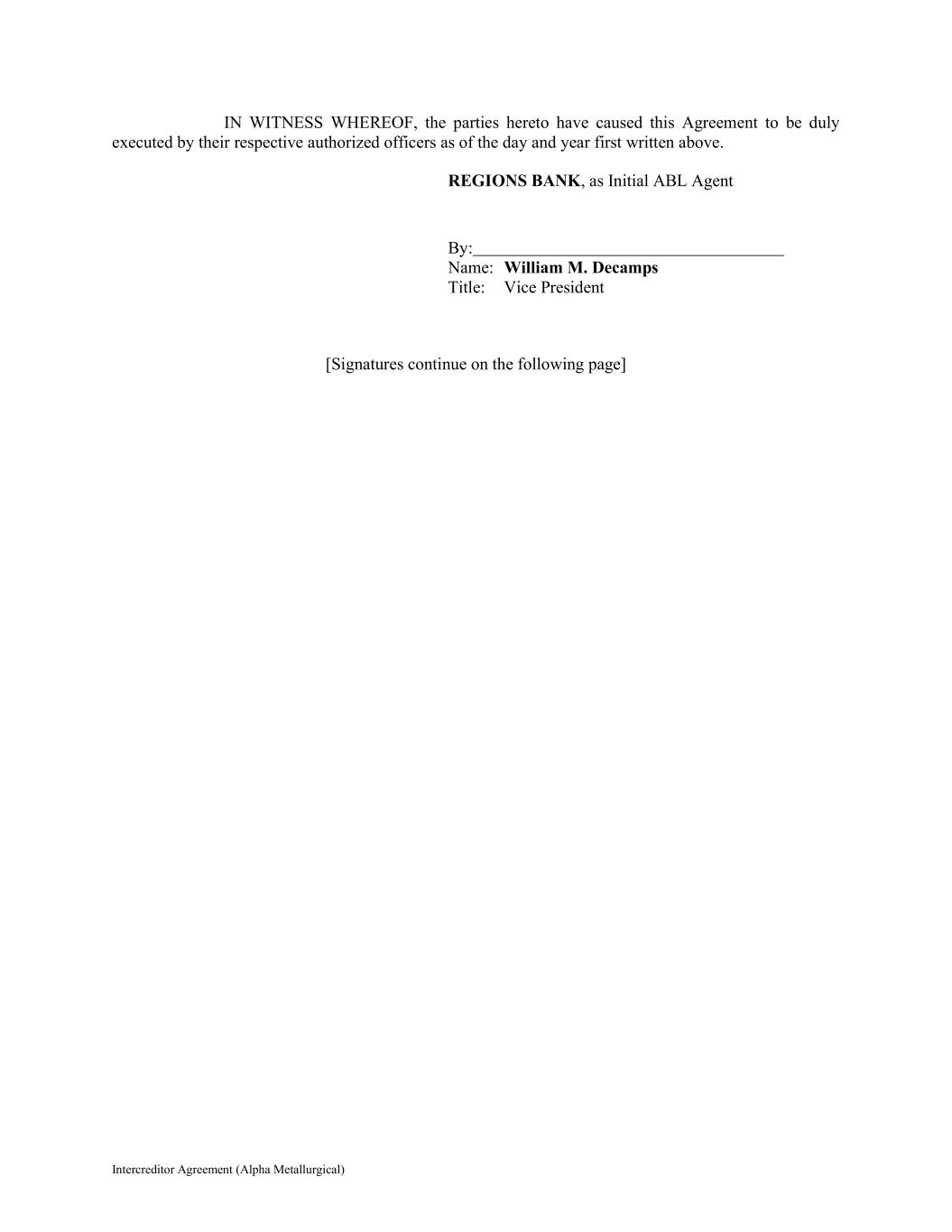 Intercreditor Agreement (Alpha Metallurgical) IN WITNESS WHEREOF, the parties hereto have caused this Agreement to be duly executed by their respective authorized officers as of the day and year first written above. REGIONS BANK, as Initial ABL Agent By: Name: William M. Decamps Title: Vice President [Signatures continue on the following page]
