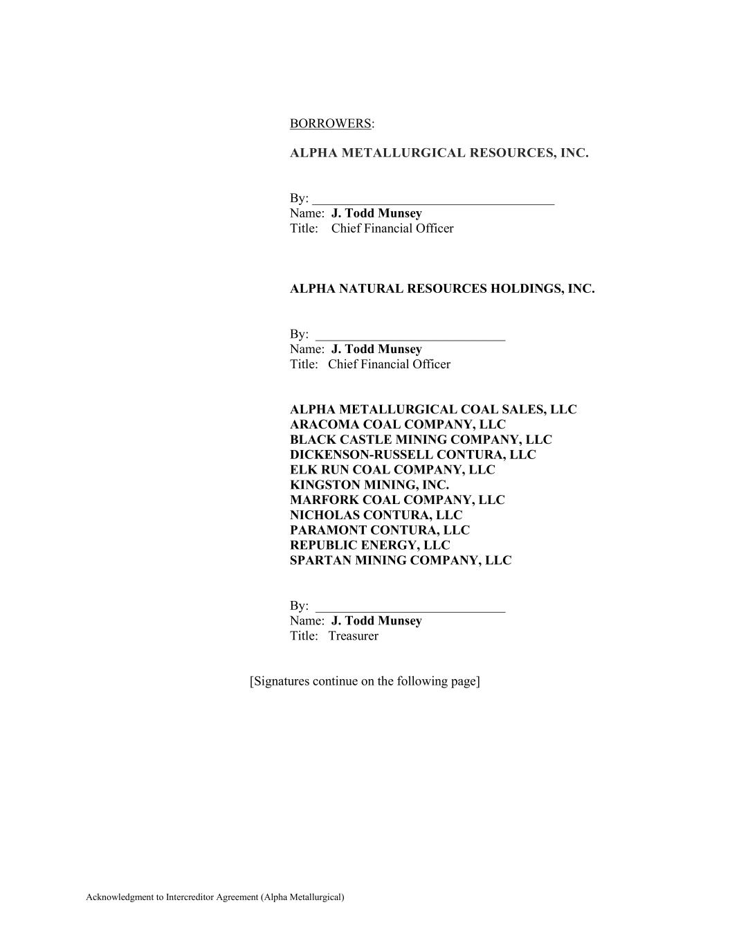 Acknowledgment to Intercreditor Agreement (Alpha Metallurgical) BORROWERS: ALPHA METALLURGICAL RESOURCES, INC. By: _____________________________________ Name: J. Todd Munsey Title: Chief Financial Officer ALPHA NATURAL RESOURCES HOLDINGS, INC. By: _____________________________ Name: J. Todd Munsey Title: Chief Financial Officer ALPHA METALLURGICAL COAL SALES, LLC ARACOMA COAL COMPANY, LLC BLACK CASTLE MINING COMPANY, LLC DICKENSON-RUSSELL CONTURA, LLC ELK RUN COAL COMPANY, LLC KINGSTON MINING, INC. MARFORK COAL COMPANY, LLC NICHOLAS CONTURA, LLC PARAMONT CONTURA, LLC REPUBLIC ENERGY, LLC SPARTAN MINING COMPANY, LLC By: _____________________________ Name: J. Todd Munsey Title: Treasurer [Signatures continue on the following page]