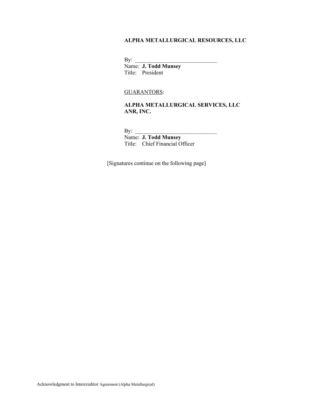Acknowledgment to Intercreditor Agreement (Alpha Metallurgical) ALPHA METALLURGICAL RESOURCES, LLC By: _____________________________ Name: J. Todd Munsey Title: President GUARANTORS: ALPHA METALLURGICAL SERVICES, LLC ANR, INC. By: _____________________________ Name: J. Todd Munsey Title: Chief Financial Officer [Signatures continue on the following page]