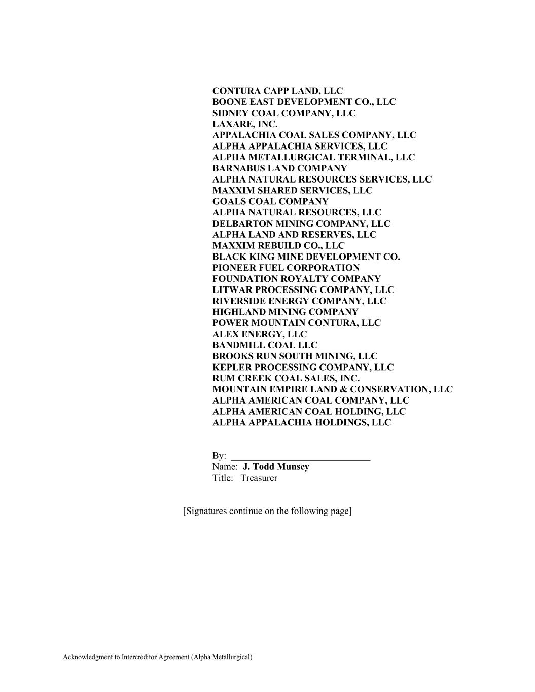 Acknowledgment to Intercreditor Agreement (Alpha Metallurgical) CONTURA CAPP LAND, LLC BOONE EAST DEVELOPMENT CO., LLC SIDNEY COAL COMPANY, LLC LAXARE, INC. APPALACHIA COAL SALES COMPANY, LLC ALPHA APPALACHIA SERVICES, LLC ALPHA METALLURGICAL TERMINAL, LLC BARNABUS LAND COMPANY ALPHA NATURAL RESOURCES SERVICES, LLC MAXXIM SHARED SERVICES, LLC GOALS COAL COMPANY ALPHA NATURAL RESOURCES, LLC DELBARTON MINING COMPANY, LLC ALPHA LAND AND RESERVES, LLC MAXXIM REBUILD CO., LLC BLACK KING MINE DEVELOPMENT CO. PIONEER FUEL CORPORATION FOUNDATION ROYALTY COMPANY LITWAR PROCESSING COMPANY, LLC RIVERSIDE ENERGY COMPANY, LLC HIGHLAND MINING COMPANY POWER MOUNTAIN CONTURA, LLC ALEX ENERGY, LLC BANDMILL COAL LLC BROOKS RUN SOUTH MINING, LLC KEPLER PROCESSING COMPANY, LLC RUM CREEK COAL SALES, INC. MOUNTAIN EMPIRE LAND & CONSERVATION, LLC ALPHA AMERICAN COAL COMPANY, LLC ALPHA AMERICAN COAL HOLDING, LLC ALPHA APPALACHIA HOLDINGS, LLC By: _____________________________ Name: J. Todd Munsey Title: Treasurer [Signatures continue on the following page]