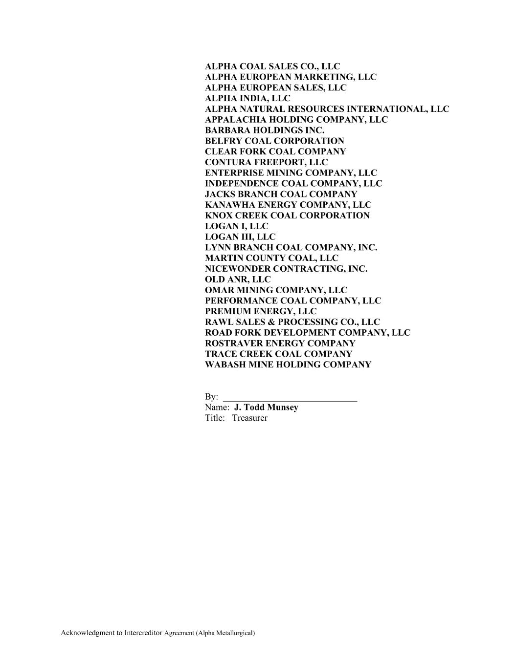 Acknowledgment to Intercreditor Agreement (Alpha Metallurgical) ALPHA COAL SALES CO., LLC ALPHA EUROPEAN MARKETING, LLC ALPHA EUROPEAN SALES, LLC ALPHA INDIA, LLC ALPHA NATURAL RESOURCES INTERNATIONAL, LLC APPALACHIA HOLDING COMPANY, LLC BARBARA HOLDINGS INC. BELFRY COAL CORPORATION CLEAR FORK COAL COMPANY CONTURA FREEPORT, LLC ENTERPRISE MINING COMPANY, LLC INDEPENDENCE COAL COMPANY, LLC JACKS BRANCH COAL COMPANY KANAWHA ENERGY COMPANY, LLC KNOX CREEK COAL CORPORATION LOGAN I, LLC LOGAN III, LLC LYNN BRANCH COAL COMPANY, INC. MARTIN COUNTY COAL, LLC NICEWONDER CONTRACTING, INC. OLD ANR, LLC OMAR MINING COMPANY, LLC PERFORMANCE COAL COMPANY, LLC PREMIUM ENERGY, LLC RAWL SALES & PROCESSING CO., LLC ROAD FORK DEVELOPMENT COMPANY, LLC ROSTRAVER ENERGY COMPANY TRACE CREEK COAL COMPANY WABASH MINE HOLDING COMPANY By: _____________________________ Name: J. Todd Munsey Title: Treasurer