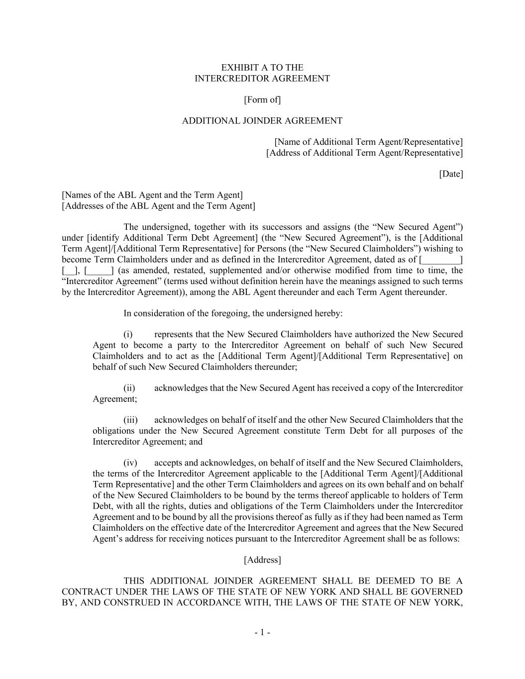 - 1 - EXHIBIT A TO THE INTERCREDITOR AGREEMENT [Form of] ADDITIONAL JOINDER AGREEMENT [Name of Additional Term Agent/Representative] [Address of Additional Term Agent/Representative] [Date] [Names of the ABL Agent and the Term Agent] [Addresses of the ABL Agent and the Term Agent] The undersigned, together with its successors and assigns (the “New Secured Agent”) under [identify Additional Term Debt Agreement] (the “New Secured Agreement”), is the [Additional Term Agent]/[Additional Term Representative] for Persons (the “New Secured Claimholders”) wishing to become Term Claimholders under and as defined in the Intercreditor Agreement, dated as of [________] [__], [_____] (as amended, restated, supplemented and/or otherwise modified from time to time, the “Intercreditor Agreement” (terms used without definition herein have the meanings assigned to such terms by the Intercreditor Agreement)), among the ABL Agent thereunder and each Term Agent thereunder. In consideration of the foregoing, the undersigned hereby: (i) represents that the New Secured Claimholders have authorized the New Secured Agent to become a party to the Intercreditor Agreement on behalf of such New Secured Claimholders and to act as the [Additional Term Agent]/[Additional Term Representative] on behalf of such New Secured Claimholders thereunder; (ii) acknowledges that the New Secured Agent has received a copy of the Intercreditor Agreement; (iii) acknowledges on behalf of itself and the other New Secured Claimholders that the obligations under the New Secured Agreement constitute Term Debt for all purposes of the Intercreditor Agreement; and (iv) accepts and acknowledges, on behalf of itself and the New Secured Claimholders, the terms of the Intercreditor Agreement applicable to the [Additional Term Agent]/[Additional Term Representative] and the other Term Claimholders and agrees on its own behalf and on behalf of the New Secured Claimholders to be bound by the terms thereof applicable to holders of Term Debt, with all the rights, duties and obligations of the Term Claimholders under the Intercreditor Agreement and to be bound by all the provisions thereof as fully as if they had been named as Term Claimholders on the effective date of the Intercreditor Agreement and agrees that the New Secured Agent’s address for receiving notices pursuant to the Intercreditor Agreement shall be as follows: [Address] THIS ADDITIONAL JOINDER AGREEMENT SHALL BE DEEMED TO BE A CONTRACT UNDER THE LAWS OF THE STATE OF NEW YORK AND SHALL BE GOVERNED BY, AND CONSTRUED IN ACCORDANCE WITH, THE LAWS OF THE STATE OF NEW YORK,