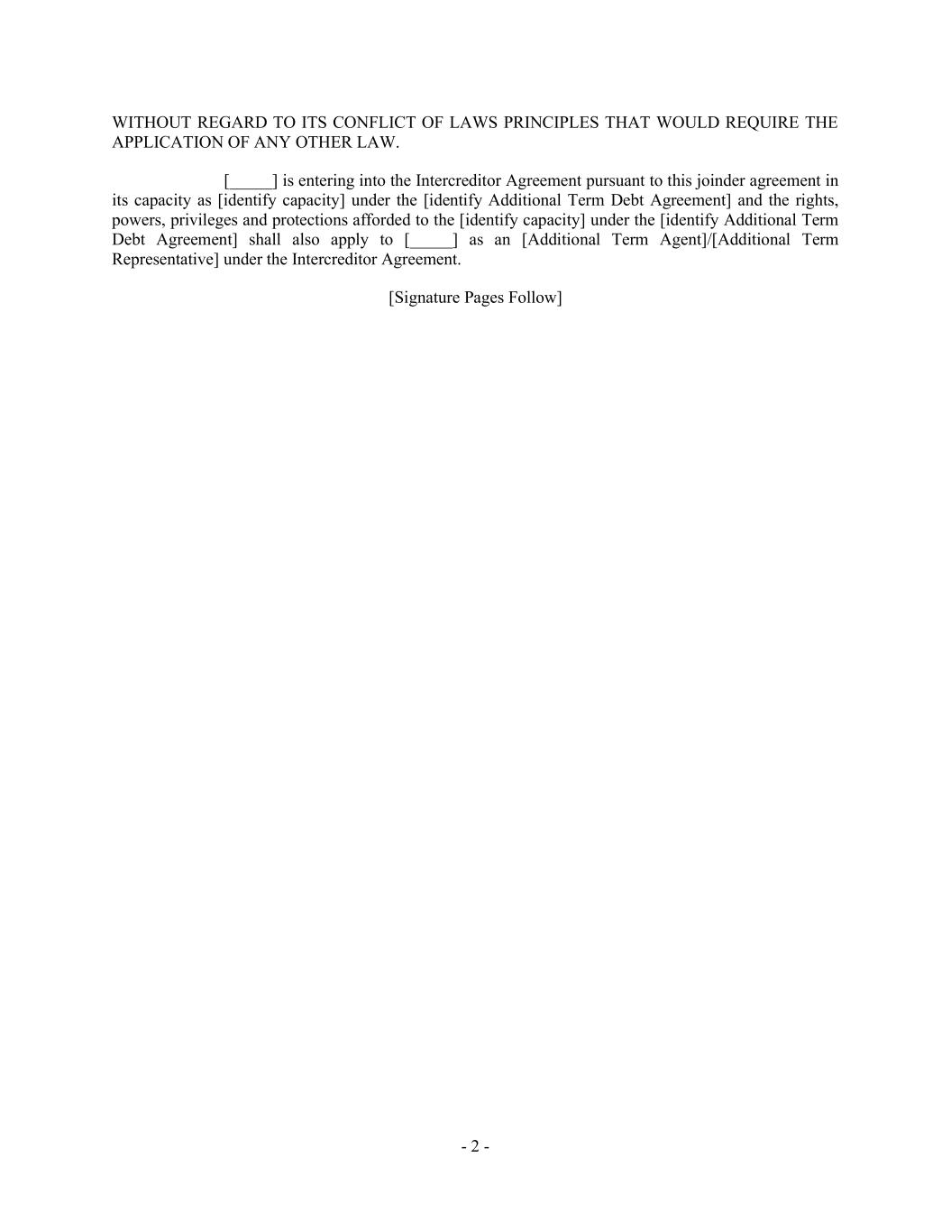 - 2 - WITHOUT REGARD TO ITS CONFLICT OF LAWS PRINCIPLES THAT WOULD REQUIRE THE APPLICATION OF ANY OTHER LAW. [_____] is entering into the Intercreditor Agreement pursuant to this joinder agreement in its capacity as [identify capacity] under the [identify Additional Term Debt Agreement] and the rights, powers, privileges and protections afforded to the [identify capacity] under the [identify Additional Term Debt Agreement] shall also apply to [_____] as an [Additional Term Agent]/[Additional Term Representative] under the Intercreditor Agreement. [Signature Pages Follow]