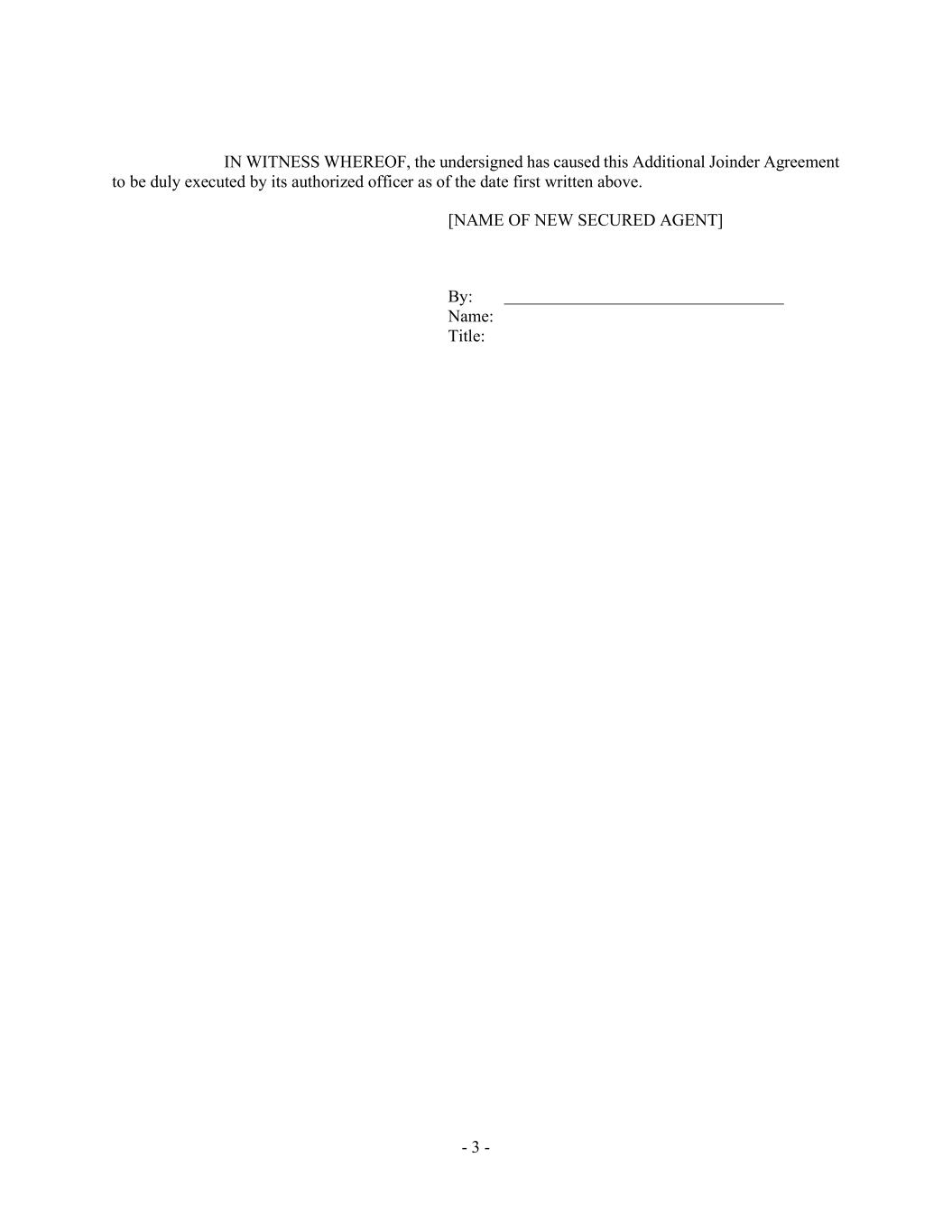 - 3 - IN WITNESS WHEREOF, the undersigned has caused this Additional Joinder Agreement to be duly executed by its authorized officer as of the date first written above. [NAME OF NEW SECURED AGENT] By: Name: Title: