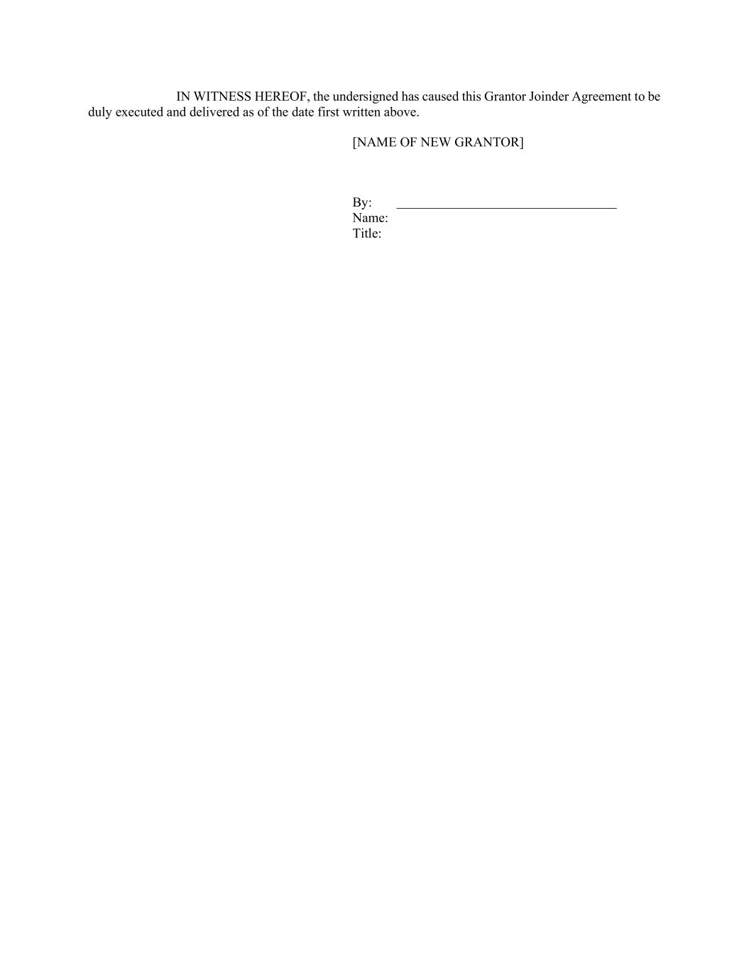 IN WITNESS HEREOF, the undersigned has caused this Grantor Joinder Agreement to be duly executed and delivered as of the date first written above. [NAME OF NEW GRANTOR] By: Name: Title: