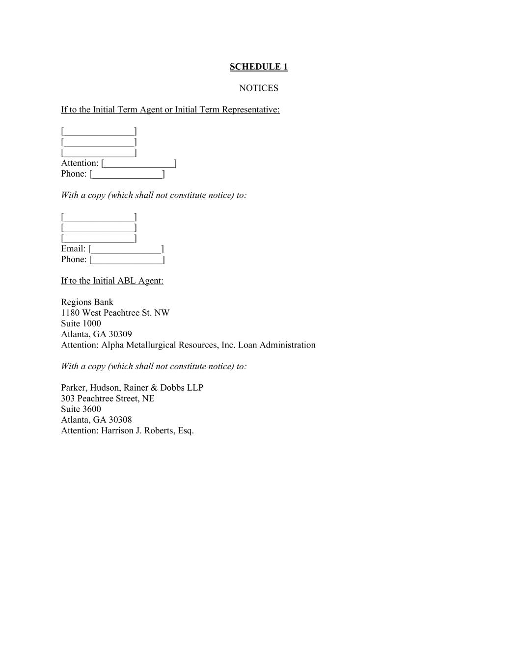 SCHEDULE 1 NOTICES If to the Initial Term Agent or Initial Term Representative: [_______________] [_______________] [_______________] Attention: [_______________] Phone: [_______________] With a copy (which shall not constitute notice) to: [_______________] [_______________] [_______________] Email: [_______________] Phone: [_______________] If to the Initial ABL Agent: Regions Bank 1180 West Peachtree St. NW Suite 1000 Atlanta, GA 30309 Attention: Alpha Metallurgical Resources, Inc. Loan Administration With a copy (which shall not constitute notice) to: Parker, Hudson, Rainer & Dobbs LLP 303 Peachtree Street, NE Suite 3600 Atlanta, GA 30308 Attention: Harrison J. Roberts, Esq.