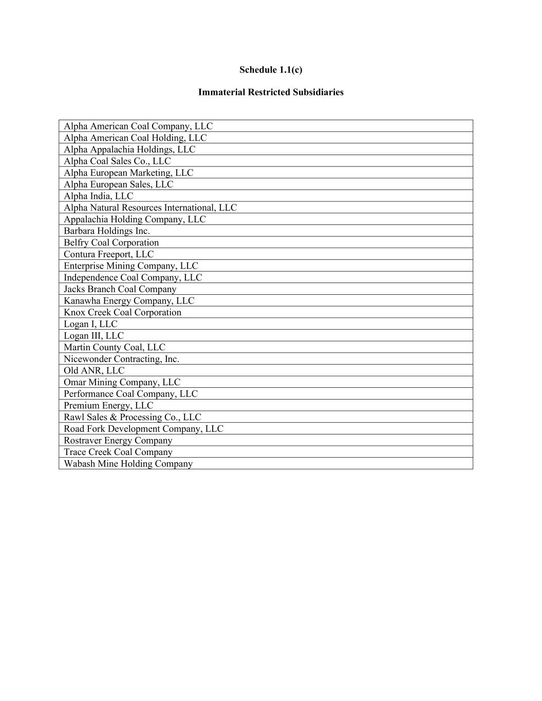Schedule 1.1(c) Immaterial Restricted Subsidiaries Alpha American Coal Company, LLC Alpha American Coal Holding, LLC Alpha Appalachia Holdings, LLC Alpha Coal Sales Co., LLC Alpha European Marketing, LLC Alpha European Sales, LLC Alpha India, LLC Alpha Natural Resources International, LLC Appalachia Holding Company, LLC Barbara Holdings Inc. Belfry Coal Corporation Contura Freeport, LLC Enterprise Mining Company, LLC Independence Coal Company, LLC Jacks Branch Coal Company Kanawha Energy Company, LLC Knox Creek Coal Corporation Logan I, LLC Logan III, LLC Martin County Coal, LLC Nicewonder Contracting, Inc. Old ANR, LLC Omar Mining Company, LLC Performance Coal Company, LLC Premium Energy, LLC Rawl Sales & Processing Co., LLC Road Fork Development Company, LLC Rostraver Energy Company Trace Creek Coal Company Wabash Mine Holding Company