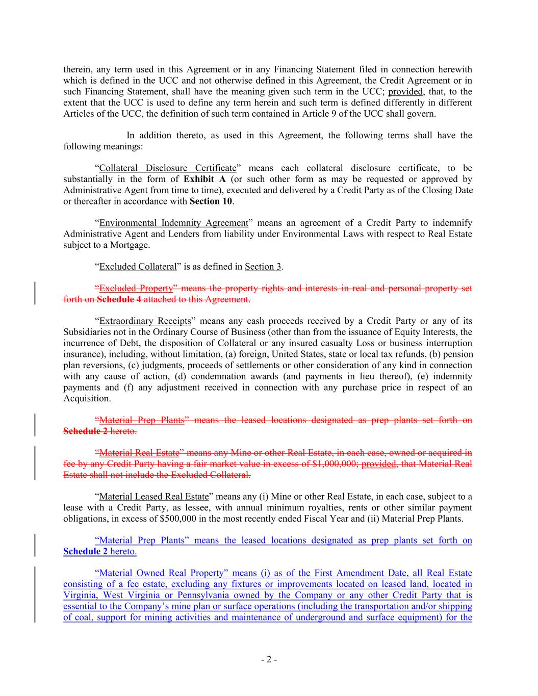 therein, any term used in this Agreement or in any Financing Statement filed in connection herewith which is defined in the UCC and not otherwise defined in this Agreement, the Credit Agreement or in such Financing Statement, shall have the meaning given such term in the UCC; provided, that, to the extent that the UCC is used to define any term herein and such term is defined differently in different Articles of the UCC, the definition of such term contained in Article 9 of the UCC shall govern. In addition thereto, as used in this Agreement, the following terms shall have the following meanings: “Collateral Disclosure Certificate” means each collateral disclosure certificate, to be substantially in the form of Exhibit A (or such other form as may be requested or approved by Administrative Agent from time to time), executed and delivered by a Credit Party as of the Closing Date or thereafter in accordance with Section 10. “Environmental Indemnity Agreement” means an agreement of a Credit Party to indemnify Administrative Agent and Lenders from liability under Environmental Laws with respect to Real Estate subject to a Mortgage. “Excluded Collateral” is as defined in Section 3. “Excluded Property” means the property rights and interests in real and personal property set forth on Schedule 4 attached to this Agreement. “Extraordinary Receipts” means any cash proceeds received by a Credit Party or any of its Subsidiaries not in the Ordinary Course of Business (other than from the issuance of Equity Interests, the incurrence of Debt, the disposition of Collateral or any insured casualty Loss or business interruption insurance), including, without limitation, (a) foreign, United States, state or local tax refunds, (b) pension plan reversions, (c) judgments, proceeds of settlements or other consideration of any kind in connection with any cause of action, (d) condemnation awards (and payments in lieu thereof), (e) indemnity payments and (f) any adjustment received in connection with any purchase price in respect of an Acquisition. “Material Prep Plants” means the leased locations designated as prep plants set forth on Schedule 2 hereto. “Material Real Estate” means any Mine or other Real Estate, in each case, owned or acquired in fee by any Credit Party having a fair market value in excess of $1,000,000; provided, that Material Real Estate shall not include the Excluded Collateral. “Material Leased Real Estate” means any (i) Mine or other Real Estate, in each case, subject to a lease with a Credit Party, as lessee, with annual minimum royalties, rents or other similar payment obligations, in excess of $500,000 in the most recently ended Fiscal Year and (ii) Material Prep Plants. “Material Prep Plants” means the leased locations designated as prep plants set forth on Schedule 2 hereto. “Material Owned Real Property” means (i) as of the First Amendment Date, all Real Estate consisting of a fee estate, excluding any fixtures or improvements located on leased land, located in Virginia, West Virginia or Pennsylvania owned by the Company or any other Credit Party that is essential to the Company’s mine plan or surface operations (including the transportation and/or shipping of coal, support for mining activities and maintenance of underground and surface equipment) for the - 2 -