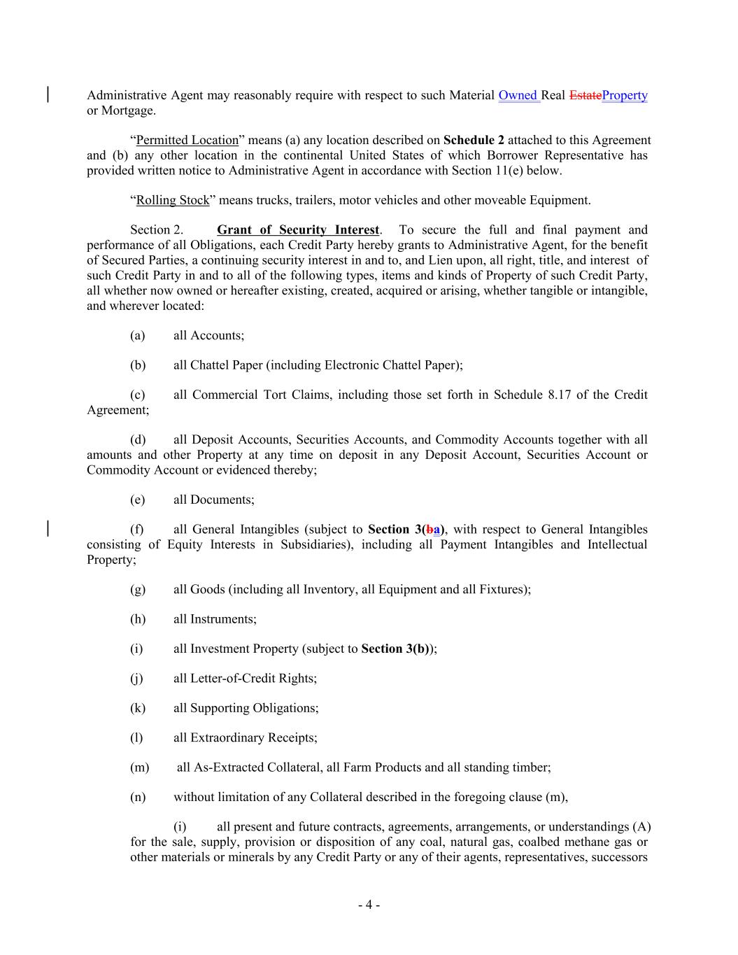 Administrative Agent may reasonably require with respect to such Material Owned Real EstateProperty or Mortgage. “Permitted Location” means (a) any location described on Schedule 2 attached to this Agreement and (b) any other location in the continental United States of which Borrower Representative has provided written notice to Administrative Agent in accordance with Section 11(e) below. “Rolling Stock” means trucks, trailers, motor vehicles and other moveable Equipment. Section 2. Grant of Security Interest. To secure the full and final payment and performance of all Obligations, each Credit Party hereby grants to Administrative Agent, for the benefit of Secured Parties, a continuing security interest in and to, and Lien upon, all right, title, and interest of such Credit Party in and to all of the following types, items and kinds of Property of such Credit Party, all whether now owned or hereafter existing, created, acquired or arising, whether tangible or intangible, and wherever located: (a) all Accounts; (b) all Chattel Paper (including Electronic Chattel Paper); (c) all Commercial Tort Claims, including those set forth in Schedule 8.17 of the Credit Agreement; (d) all Deposit Accounts, Securities Accounts, and Commodity Accounts together with all amounts and other Property at any time on deposit in any Deposit Account, Securities Account or Commodity Account or evidenced thereby; (e) all Documents; (f) all General Intangibles (subject to Section 3(ba), with respect to General Intangibles consisting of Equity Interests in Subsidiaries), including all Payment Intangibles and Intellectual Property; (g) all Goods (including all Inventory, all Equipment and all Fixtures); (h) all Instruments; (i) all Investment Property (subject to Section 3(b)); (j) all Letter-of-Credit Rights; (k) all Supporting Obligations; (l) all Extraordinary Receipts; (m) all As-Extracted Collateral, all Farm Products and all standing timber; (n) without limitation of any Collateral described in the foregoing clause (m), (i) all present and future contracts, agreements, arrangements, or understandings (A) for the sale, supply, provision or disposition of any coal, natural gas, coalbed methane gas or other materials or minerals by any Credit Party or any of their agents, representatives, successors - 4 -