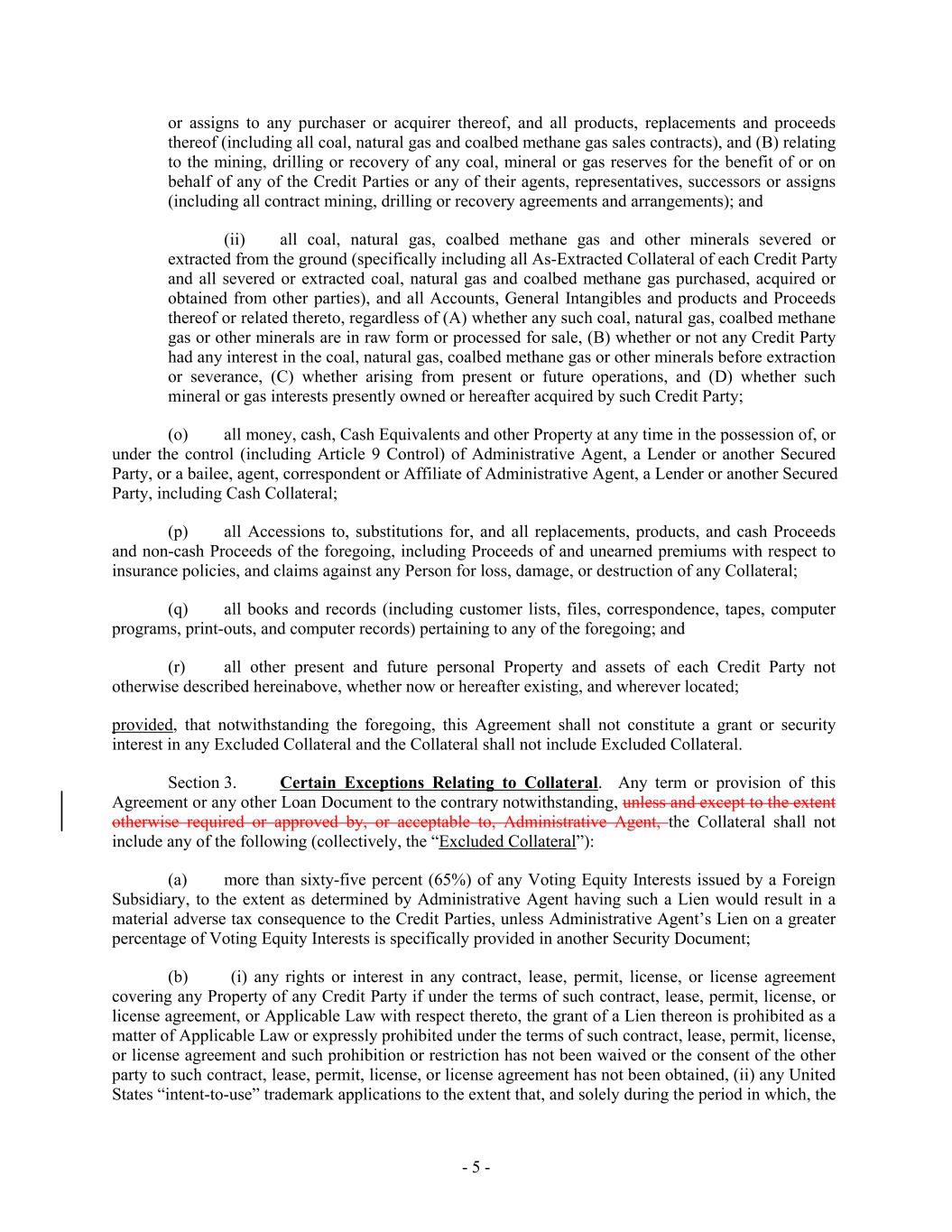 or assigns to any purchaser or acquirer thereof, and all products, replacements and proceeds thereof (including all coal, natural gas and coalbed methane gas sales contracts), and (B) relating to the mining, drilling or recovery of any coal, mineral or gas reserves for the benefit of or on behalf of any of the Credit Parties or any of their agents, representatives, successors or assigns (including all contract mining, drilling or recovery agreements and arrangements); and (ii) all coal, natural gas, coalbed methane gas and other minerals severed or extracted from the ground (specifically including all As-Extracted Collateral of each Credit Party and all severed or extracted coal, natural gas and coalbed methane gas purchased, acquired or obtained from other parties), and all Accounts, General Intangibles and products and Proceeds thereof or related thereto, regardless of (A) whether any such coal, natural gas, coalbed methane gas or other minerals are in raw form or processed for sale, (B) whether or not any Credit Party had any interest in the coal, natural gas, coalbed methane gas or other minerals before extraction or severance, (C) whether arising from present or future operations, and (D) whether such mineral or gas interests presently owned or hereafter acquired by such Credit Party; (o) all money, cash, Cash Equivalents and other Property at any time in the possession of, or under the control (including Article 9 Control) of Administrative Agent, a Lender or another Secured Party, or a bailee, agent, correspondent or Affiliate of Administrative Agent, a Lender or another Secured Party, including Cash Collateral; (p) all Accessions to, substitutions for, and all replacements, products, and cash Proceeds and non-cash Proceeds of the foregoing, including Proceeds of and unearned premiums with respect to insurance policies, and claims against any Person for loss, damage, or destruction of any Collateral; (q) all books and records (including customer lists, files, correspondence, tapes, computer programs, print-outs, and computer records) pertaining to any of the foregoing; and (r) all other present and future personal Property and assets of each Credit Party not otherwise described hereinabove, whether now or hereafter existing, and wherever located; provided, that notwithstanding the foregoing, this Agreement shall not constitute a grant or security interest in any Excluded Collateral and the Collateral shall not include Excluded Collateral. Section 3. Certain Exceptions Relating to Collateral. Any term or provision of this Agreement or any other Loan Document to the contrary notwithstanding, unless and except to the extent otherwise required or approved by, or acceptable to, Administrative Agent, the Collateral shall not include any of the following (collectively, the “Excluded Collateral”): (a) more than sixty-five percent (65%) of any Voting Equity Interests issued by a Foreign Subsidiary, to the extent as determined by Administrative Agent having such a Lien would result in a material adverse tax consequence to the Credit Parties, unless Administrative Agent’s Lien on a greater percentage of Voting Equity Interests is specifically provided in another Security Document; (b) (i) any rights or interest in any contract, lease, permit, license, or license agreement covering any Property of any Credit Party if under the terms of such contract, lease, permit, license, or license agreement, or Applicable Law with respect thereto, the grant of a Lien thereon is prohibited as a matter of Applicable Law or expressly prohibited under the terms of such contract, lease, permit, license, or license agreement and such prohibition or restriction has not been waived or the consent of the other party to such contract, lease, permit, license, or license agreement has not been obtained, (ii) any United States “intent-to-use” trademark applications to the extent that, and solely during the period in which, the - 5 -