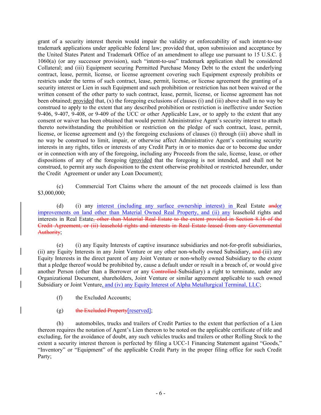 grant of a security interest therein would impair the validity or enforceability of such intent-to-use trademark applications under applicable federal law; provided that, upon submission and acceptance by the United States Patent and Trademark Office of an amendment to allege use pursuant to 15 U.S.C. § 1060(a) (or any successor provision), such “intent-to-use” trademark application shall be considered Collateral; and (iii) Equipment securing Permitted Purchase Money Debt to the extent the underlying contract, lease, permit, license, or license agreement covering such Equipment expressly prohibits or restricts under the terms of such contract, lease, permit, license, or license agreement the granting of a security interest or Lien in such Equipment and such prohibition or restriction has not been waived or the written consent of the other party to such contract, lease, permit, license, or license agreement has not been obtained; provided that, (x) the foregoing exclusions of clauses (i) and (iii) above shall in no way be construed to apply to the extent that any described prohibition or restriction is ineffective under Section 9-406, 9-407, 9-408, or 9-409 of the UCC or other Applicable Law, or to apply to the extent that any consent or waiver has been obtained that would permit Administrative Agent’s security interest to attach thereto notwithstanding the prohibition or restriction on the pledge of such contract, lease, permit, license, or license agreement and (y) the foregoing exclusions of clauses (i) through (iii) above shall in no way be construed to limit, impair, or otherwise affect Administrative Agent’s continuing security interests in any rights, titles or interests of any Credit Party in or to monies due or to become due under or in connection with any of the foregoing, including any Proceeds from the sale, license, lease, or other dispositions of any of the foregoing (provided that the foregoing is not intended, and shall not be construed, to permit any such disposition to the extent otherwise prohibited or restricted hereunder, under the Credit Agreement or under any Loan Document); (c) Commercial Tort Claims where the amount of the net proceeds claimed is less than $3,000,000; (d) (i) any interest (including any surface ownership interest) in Real Estate andor improvements on land other than Material Owned Real Property, and (ii) any leasehold rights and interests in Real Estate, other than Material Real Estate to the extent provided in Section 8.16 of the Credit Agreement, or (ii) leasehold rights and interests in Real Estate leased from any Governmental Authority; (e) (i) any Equity Interests of captive insurance subsidiaries and not-for-profit subsidiaries, (ii) any Equity Interests in any Joint Venture or any other non-wholly owned Subsidiary, and (iii) any Equity Interests in the direct parent of any Joint Venture or non-wholly owned Subsidiary to the extent that a pledge thereof would be prohibited by, cause a default under or result in a breach of, or would give another Person (other than a Borrower or any Controlled Subsidiary) a right to terminate, under any Organizational Document, shareholders, Joint Venture or similar agreement applicable to such owned Subsidiary or Joint Venture, and (iv) any Equity Interest of Alpha Metallurgical Terminal, LLC; (f) the Excluded Accounts; (g) the Excluded Property[reserved]; (h) automobiles, trucks and trailers of Credit Parties to the extent that perfection of a Lien thereon requires the notation of Agent’s Lien thereon to be noted on the applicable certificate of title and excluding, for the avoidance of doubt, any such vehicles trucks and trailers or other Rolling Stock to the extent a security interest thereon is perfected by filing a UCC-1 Financing Statement against “Goods,” “Inventory” or “Equipment” of the applicable Credit Party in the proper filing office for such Credit Party; - 6 -
