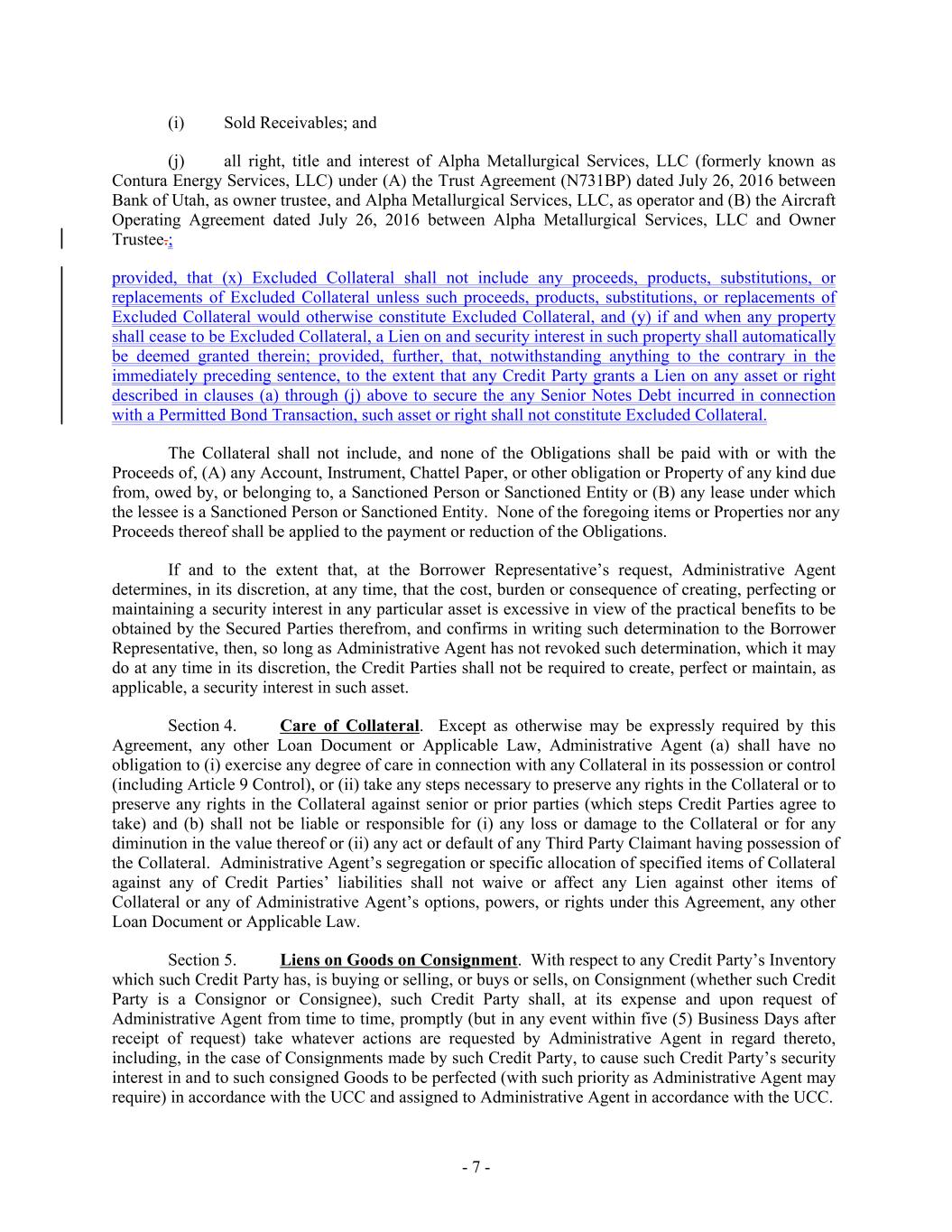 (i) Sold Receivables; and (j) all right, title and interest of Alpha Metallurgical Services, LLC (formerly known as Contura Energy Services, LLC) under (A) the Trust Agreement (N731BP) dated July 26, 2016 between Bank of Utah, as owner trustee, and Alpha Metallurgical Services, LLC, as operator and (B) the Aircraft Operating Agreement dated July 26, 2016 between Alpha Metallurgical Services, LLC and Owner Trustee.; provided, that (x) Excluded Collateral shall not include any proceeds, products, substitutions, or replacements of Excluded Collateral unless such proceeds, products, substitutions, or replacements of Excluded Collateral would otherwise constitute Excluded Collateral, and (y) if and when any property shall cease to be Excluded Collateral, a Lien on and security interest in such property shall automatically be deemed granted therein; provided, further, that, notwithstanding anything to the contrary in the immediately preceding sentence, to the extent that any Credit Party grants a Lien on any asset or right described in clauses (a) through (j) above to secure the any Senior Notes Debt incurred in connection with a Permitted Bond Transaction, such asset or right shall not constitute Excluded Collateral. The Collateral shall not include, and none of the Obligations shall be paid with or with the Proceeds of, (A) any Account, Instrument, Chattel Paper, or other obligation or Property of any kind due from, owed by, or belonging to, a Sanctioned Person or Sanctioned Entity or (B) any lease under which the lessee is a Sanctioned Person or Sanctioned Entity. None of the foregoing items or Properties nor any Proceeds thereof shall be applied to the payment or reduction of the Obligations. If and to the extent that, at the Borrower Representative’s request, Administrative Agent determines, in its discretion, at any time, that the cost, burden or consequence of creating, perfecting or maintaining a security interest in any particular asset is excessive in view of the practical benefits to be obtained by the Secured Parties therefrom, and confirms in writing such determination to the Borrower Representative, then, so long as Administrative Agent has not revoked such determination, which it may do at any time in its discretion, the Credit Parties shall not be required to create, perfect or maintain, as applicable, a security interest in such asset. Section 4. Care of Collateral. Except as otherwise may be expressly required by this Agreement, any other Loan Document or Applicable Law, Administrative Agent (a) shall have no obligation to (i) exercise any degree of care in connection with any Collateral in its possession or control (including Article 9 Control), or (ii) take any steps necessary to preserve any rights in the Collateral or to preserve any rights in the Collateral against senior or prior parties (which steps Credit Parties agree to take) and (b) shall not be liable or responsible for (i) any loss or damage to the Collateral or for any diminution in the value thereof or (ii) any act or default of any Third Party Claimant having possession of the Collateral. Administrative Agent’s segregation or specific allocation of specified items of Collateral against any of Credit Parties’ liabilities shall not waive or affect any Lien against other items of Collateral or any of Administrative Agent’s options, powers, or rights under this Agreement, any other Loan Document or Applicable Law. Section 5. Liens on Goods on Consignment. With respect to any Credit Party’s Inventory which such Credit Party has, is buying or selling, or buys or sells, on Consignment (whether such Credit Party is a Consignor or Consignee), such Credit Party shall, at its expense and upon request of Administrative Agent from time to time, promptly (but in any event within five (5) Business Days after receipt of request) take whatever actions are requested by Administrative Agent in regard thereto, including, in the case of Consignments made by such Credit Party, to cause such Credit Party’s security interest in and to such consigned Goods to be perfected (with such priority as Administrative Agent may require) in accordance with the UCC and assigned to Administrative Agent in accordance with the UCC. - 7 -