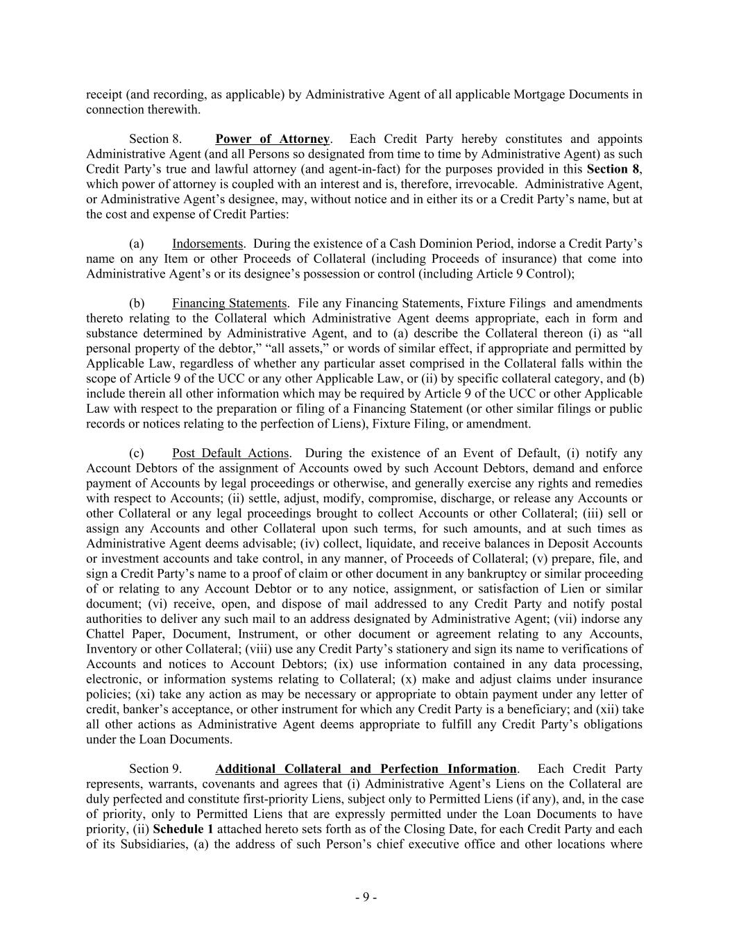 receipt (and recording, as applicable) by Administrative Agent of all applicable Mortgage Documents in connection therewith. Section 8. Power of Attorney. Each Credit Party hereby constitutes and appoints Administrative Agent (and all Persons so designated from time to time by Administrative Agent) as such Credit Party’s true and lawful attorney (and agent-in-fact) for the purposes provided in this Section 8, which power of attorney is coupled with an interest and is, therefore, irrevocable. Administrative Agent, or Administrative Agent’s designee, may, without notice and in either its or a Credit Party’s name, but at the cost and expense of Credit Parties: (a) Indorsements. During the existence of a Cash Dominion Period, indorse a Credit Party’s name on any Item or other Proceeds of Collateral (including Proceeds of insurance) that come into Administrative Agent’s or its designee’s possession or control (including Article 9 Control); (b) Financing Statements. File any Financing Statements, Fixture Filings and amendments thereto relating to the Collateral which Administrative Agent deems appropriate, each in form and substance determined by Administrative Agent, and to (a) describe the Collateral thereon (i) as “all personal property of the debtor,” “all assets,” or words of similar effect, if appropriate and permitted by Applicable Law, regardless of whether any particular asset comprised in the Collateral falls within the scope of Article 9 of the UCC or any other Applicable Law, or (ii) by specific collateral category, and (b) include therein all other information which may be required by Article 9 of the UCC or other Applicable Law with respect to the preparation or filing of a Financing Statement (or other similar filings or public records or notices relating to the perfection of Liens), Fixture Filing, or amendment. (c) Post Default Actions. During the existence of an Event of Default, (i) notify any Account Debtors of the assignment of Accounts owed by such Account Debtors, demand and enforce payment of Accounts by legal proceedings or otherwise, and generally exercise any rights and remedies with respect to Accounts; (ii) settle, adjust, modify, compromise, discharge, or release any Accounts or other Collateral or any legal proceedings brought to collect Accounts or other Collateral; (iii) sell or assign any Accounts and other Collateral upon such terms, for such amounts, and at such times as Administrative Agent deems advisable; (iv) collect, liquidate, and receive balances in Deposit Accounts or investment accounts and take control, in any manner, of Proceeds of Collateral; (v) prepare, file, and sign a Credit Party’s name to a proof of claim or other document in any bankruptcy or similar proceeding of or relating to any Account Debtor or to any notice, assignment, or satisfaction of Lien or similar document; (vi) receive, open, and dispose of mail addressed to any Credit Party and notify postal authorities to deliver any such mail to an address designated by Administrative Agent; (vii) indorse any Chattel Paper, Document, Instrument, or other document or agreement relating to any Accounts, Inventory or other Collateral; (viii) use any Credit Party’s stationery and sign its name to verifications of Accounts and notices to Account Debtors; (ix) use information contained in any data processing, electronic, or information systems relating to Collateral; (x) make and adjust claims under insurance policies; (xi) take any action as may be necessary or appropriate to obtain payment under any letter of credit, banker’s acceptance, or other instrument for which any Credit Party is a beneficiary; and (xii) take all other actions as Administrative Agent deems appropriate to fulfill any Credit Party’s obligations under the Loan Documents. Section 9. Additional Collateral and Perfection Information. Each Credit Party represents, warrants, covenants and agrees that (i) Administrative Agent’s Liens on the Collateral are duly perfected and constitute first-priority Liens, subject only to Permitted Liens (if any), and, in the case of priority, only to Permitted Liens that are expressly permitted under the Loan Documents to have priority, (ii) Schedule 1 attached hereto sets forth as of the Closing Date, for each Credit Party and each of its Subsidiaries, (a) the address of such Person’s chief executive office and other locations where - 9 -