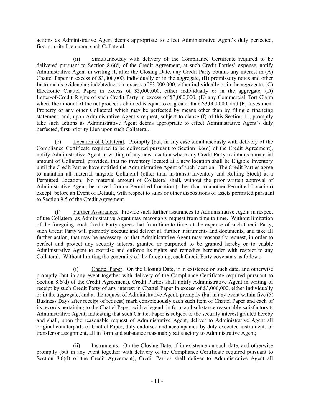 actions as Administrative Agent deems appropriate to effect Administrative Agent’s duly perfected, first-priority Lien upon such Collateral. (ii) Simultaneously with delivery of the Compliance Certificate required to be delivered pursuant to Section 8.6(d) of the Credit Agreement, at such Credit Parties’ expense, notify Administrative Agent in writing if, after the Closing Date, any Credit Party obtains any interest in (A) Chattel Paper in excess of $3,000,000, individually or in the aggregate, (B) promissory notes and other Instruments evidencing indebtedness in excess of $3,000,000, either individually or in the aggregate, (C) Electronic Chattel Paper in excess of $3,000,000, either individually or in the aggregate, (D) Letter-of-Credit Rights of such Credit Party in excess of $3,000,000, (E) any Commercial Tort Claim where the amount of the net proceeds claimed is equal to or greater than $3,000,000, and (F) Investment Property or any other Collateral which may be perfected by means other than by filing a financing statement, and, upon Administrative Agent’s request, subject to clause (f) of this Section 11, promptly take such actions as Administrative Agent deems appropriate to effect Administrative Agent’s duly perfected, first-priority Lien upon such Collateral. (e) Location of Collateral. Promptly (but, in any case simultaneously with delivery of the Compliance Certificate required to be delivered pursuant to Section 8.6(d) of the Credit Agreement), notify Administrative Agent in writing of any new location where any Credit Party maintains a material amount of Collateral; provided, that no inventory located at a new location shall be Eligible Inventory until the Credit Parties have notified the Administrative Agent of such location. The Credit Parties agree to maintain all material tangible Collateral (other than in-transit Inventory and Rolling Stock) at a Permitted Location. No material amount of Collateral shall, without the prior written approval of Administrative Agent, be moved from a Permitted Location (other than to another Permitted Location) except, before an Event of Default, with respect to sales or other dispositions of assets permitted pursuant to Section 9.5 of the Credit Agreement. (f) Further Assurances. Provide such further assurances to Administrative Agent in respect of the Collateral as Administrative Agent may reasonably request from time to time. Without limitation of the foregoing, each Credit Party agrees that from time to time, at the expense of such Credit Party, such Credit Party will promptly execute and deliver all further instruments and documents, and take all further action, that may be necessary, or that Administrative Agent may reasonably request, in order to perfect and protect any security interest granted or purported to be granted hereby or to enable Administrative Agent to exercise and enforce its rights and remedies hereunder with respect to any Collateral. Without limiting the generality of the foregoing, each Credit Party covenants as follows: (i) Chattel Paper. On the Closing Date, if in existence on such date, and otherwise promptly (but in any event together with delivery of the Compliance Certificate required pursuant to Section 8.6(d) of the Credit Agreement), Credit Parties shall notify Administrative Agent in writing of receipt by such Credit Party of any interest in Chattel Paper in excess of $3,000,000, either individually or in the aggregate, and at the request of Administrative Agent, promptly (but in any event within five (5) Business Days after receipt of request) mark conspicuously each such item of Chattel Paper and each of its records pertaining to the Chattel Paper, with a legend, in form and substance reasonably satisfactory to Administrative Agent, indicating that such Chattel Paper is subject to the security interest granted hereby and shall, upon the reasonable request of Administrative Agent, deliver to Administrative Agent all original counterparts of Chattel Paper, duly endorsed and accompanied by duly executed instruments of transfer or assignment, all in form and substance reasonably satisfactory to Administrative Agent; (ii) Instruments. On the Closing Date, if in existence on such date, and otherwise promptly (but in any event together with delivery of the Compliance Certificate required pursuant to Section 8.6(d) of the Credit Agreement), Credit Parties shall deliver to Administrative Agent all - 11 -
