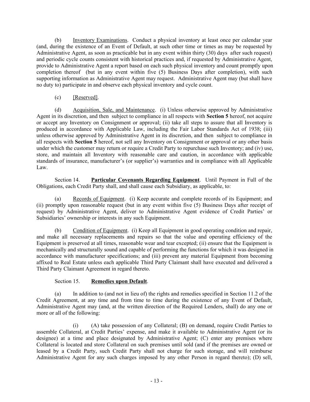 (b) Inventory Examinations. Conduct a physical inventory at least once per calendar year (and, during the existence of an Event of Default, at such other time or times as may be requested by Administrative Agent, as soon as practicable but in any event within thirty (30) days after such request) and periodic cycle counts consistent with historical practices and, if requested by Administrative Agent, provide to Administrative Agent a report based on each such physical inventory and count promptly upon completion thereof (but in any event within five (5) Business Days after completion), with such supporting information as Administrative Agent may request. Administrative Agent may (but shall have no duty to) participate in and observe each physical inventory and cycle count. (c) [Reserved]. (d) Acquisition, Sale, and Maintenance. (i) Unless otherwise approved by Administrative Agent in its discretion, and then subject to compliance in all respects with Section 5 hereof, not acquire or accept any Inventory on Consignment or approval; (ii) take all steps to assure that all Inventory is produced in accordance with Applicable Law, including the Fair Labor Standards Act of 1938; (iii) unless otherwise approved by Administrative Agent in its discretion, and then subject to compliance in all respects with Section 5 hereof, not sell any Inventory on Consignment or approval or any other basis under which the customer may return or require a Credit Party to repurchase such Inventory; and (iv) use, store, and maintain all Inventory with reasonable care and caution, in accordance with applicable standards of insurance, manufacturer’s (or supplier’s) warranties and in compliance with all Applicable Law. Section 14. Particular Covenants Regarding Equipment. Until Payment in Full of the Obligations, each Credit Party shall, and shall cause each Subsidiary, as applicable, to: (a) Records of Equipment. (i) Keep accurate and complete records of its Equipment; and (ii) promptly upon reasonable request (but in any event within five (5) Business Days after receipt of request) by Administrative Agent, deliver to Administrative Agent evidence of Credit Parties’ or Subsidiaries’ ownership or interests in any such Equipment. (b) Condition of Equipment. (i) Keep all Equipment in good operating condition and repair, and make all necessary replacements and repairs so that the value and operating efficiency of the Equipment is preserved at all times, reasonable wear and tear excepted; (ii) ensure that the Equipment is mechanically and structurally sound and capable of performing the functions for which it was designed in accordance with manufacturer specifications; and (iii) prevent any material Equipment from becoming affixed to Real Estate unless each applicable Third Party Claimant shall have executed and delivered a Third Party Claimant Agreement in regard thereto. Section 15. Remedies upon Default. (a) In addition to (and not in lieu of) the rights and remedies specified in Section 11.2 of the Credit Agreement, at any time and from time to time during the existence of any Event of Default, Administrative Agent may (and, at the written direction of the Required Lenders, shall) do any one or more or all of the following: (i) (A) take possession of any Collateral; (B) on demand, require Credit Parties to assemble Collateral, at Credit Parties’ expense, and make it available to Administrative Agent (or its designee) at a time and place designated by Administrative Agent; (C) enter any premises where Collateral is located and store Collateral on such premises until sold (and if the premises are owned or leased by a Credit Party, such Credit Party shall not charge for such storage, and will reimburse Administrative Agent for any such charges imposed by any other Person in regard thereto); (D) sell, - 13 -