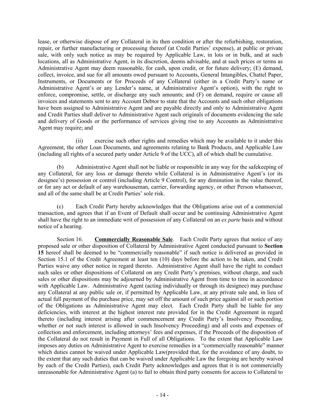 lease, or otherwise dispose of any Collateral in its then condition or after the refurbishing, restoration, repair, or further manufacturing or processing thereof (at Credit Parties’ expense), at public or private sale, with only such notice as may be required by Applicable Law, in lots or in bulk, and at such locations, all as Administrative Agent, in its discretion, deems advisable, and at such prices or terms as Administrative Agent may deem reasonable, for cash, upon credit, or for future delivery; (E) demand, collect, invoice, and sue for all amounts owed pursuant to Accounts, General Intangibles, Chattel Paper, Instruments, or Documents or for Proceeds of any Collateral (either in a Credit Party’s name or Administrative Agent’s or any Lender’s name, at Administrative Agent’s option), with the right to enforce, compromise, settle, or discharge any such amounts; and (F) on demand, require or cause all invoices and statements sent to any Account Debtor to state that the Accounts and such other obligations have been assigned to Administrative Agent and are payable directly and only to Administrative Agent and Credit Parties shall deliver to Administrative Agent such originals of documents evidencing the sale and delivery of Goods or the performance of services giving rise to any Accounts as Administrative Agent may require; and (ii) exercise such other rights and remedies which may be available to it under this Agreement, the other Loan Documents, and agreements relating to Bank Products, and Applicable Law (including all rights of a secured party under Article 9 of the UCC), all of which shall be cumulative. (b) Administrative Agent shall not be liable or responsible in any way for the safekeeping of any Collateral, for any loss or damage thereto while Collateral is in Administrative Agent’s (or its designee’s) possession or control (including Article 9 Control), for any diminution in the value thereof, or for any act or default of any warehouseman, carrier, forwarding agency, or other Person whatsoever, and all of the same shall be at Credit Parties’ sole risk. (c) Each Credit Party hereby acknowledges that the Obligations arise out of a commercial transaction, and agrees that if an Event of Default shall occur and be continuing Administrative Agent shall have the right to an immediate writ of possession of any Collateral on an ex parte basis and without notice of a hearing. Section 16. Commercially Reasonable Sale. Each Credit Party agrees that notice of any proposed sale or other disposition of Collateral by Administrative Agent conducted pursuant to Section 15 hereof shall be deemed to be “commercially reasonable” if such notice is delivered as provided in Section 15.1 of the Credit Agreement at least ten (10) days before the action to be taken, and Credit Parties waive any other notice in regard thereto. Administrative Agent shall have the right to conduct such sales or other dispositions of Collateral on any Credit Party’s premises, without charge, and such sales or other dispositions may be adjourned by Administrative Agent from time to time in accordance with Applicable Law. Administrative Agent (acting individually or through its designee) may purchase any Collateral at any public sale or, if permitted by Applicable Law, at any private sale and, in lieu of actual full payment of the purchase price, may set off the amount of such price against all or such portion of the Obligations as Administrative Agent may elect. Each Credit Party shall be liable for any deficiencies, with interest at the highest interest rate provided for in the Credit Agreement in regard thereto (including interest arising after commencement any Credit Party’s Insolvency Proceeding, whether or not such interest is allowed in such Insolvency Proceeding) and all costs and expenses of collection and enforcement, including attorneys’ fees and expenses, if the Proceeds of the disposition of the Collateral do not result in Payment in Full of all Obligations. To the extent that Applicable Law imposes any duties on Administrative Agent to exercise remedies in a “commercially reasonable” manner which duties cannot be waived under Applicable Law(provided that, for the avoidance of any doubt, to the extent that any such duties that can be waived under Applicable Law the foregoing are hereby waived by each of the Credit Parties), each Credit Party acknowledges and agrees that it is not commercially unreasonable for Administrative Agent (a) to fail to obtain third party consents for access to Collateral to - 14 -
