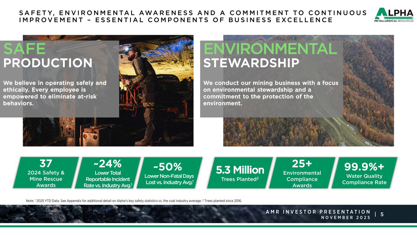 4A M R R a t i n g s A g e n c y P r e s e n t a t i o n J a n u a r y 2 0 2 5 |A M R I N V E S T O R P R E S E N T A T I O N N O V E M B E R 19 Mines 8 Preparation Plants 2 Standalone Loadouts 1 Dock 1 Export Terminal2 WV VA DTA Export Terminal2 Company Mines Processing and Shipping Facilities 76% Export 24% Domestic A L P H A AT A G L A N C E Note: Metrics as of 12/31/24 unless otherwise noted. Employee, mine and plant data as of 9/30/25. 1 For full-year 2024 shipments, by tonnage. 2 65% ownership in DTA Export Terminal. 3 Adjusted EBITDA is a non-GAAP financial measure. A reconciliation of Net Income to Adjusted EBITDA is included in the Appendix. Current Sales Mix 17.1 Million Tons of Coal Sold in 2024 $408 Million Adjusted EBITDA in 20243 #1 US Producer of Met Coal 3,960 Employees Asset Footprint Sales by Shipment Mix1 37% High Vol-A 31% High Vol-B 19% Mid Vol 13% Low Vol Sales by Type1