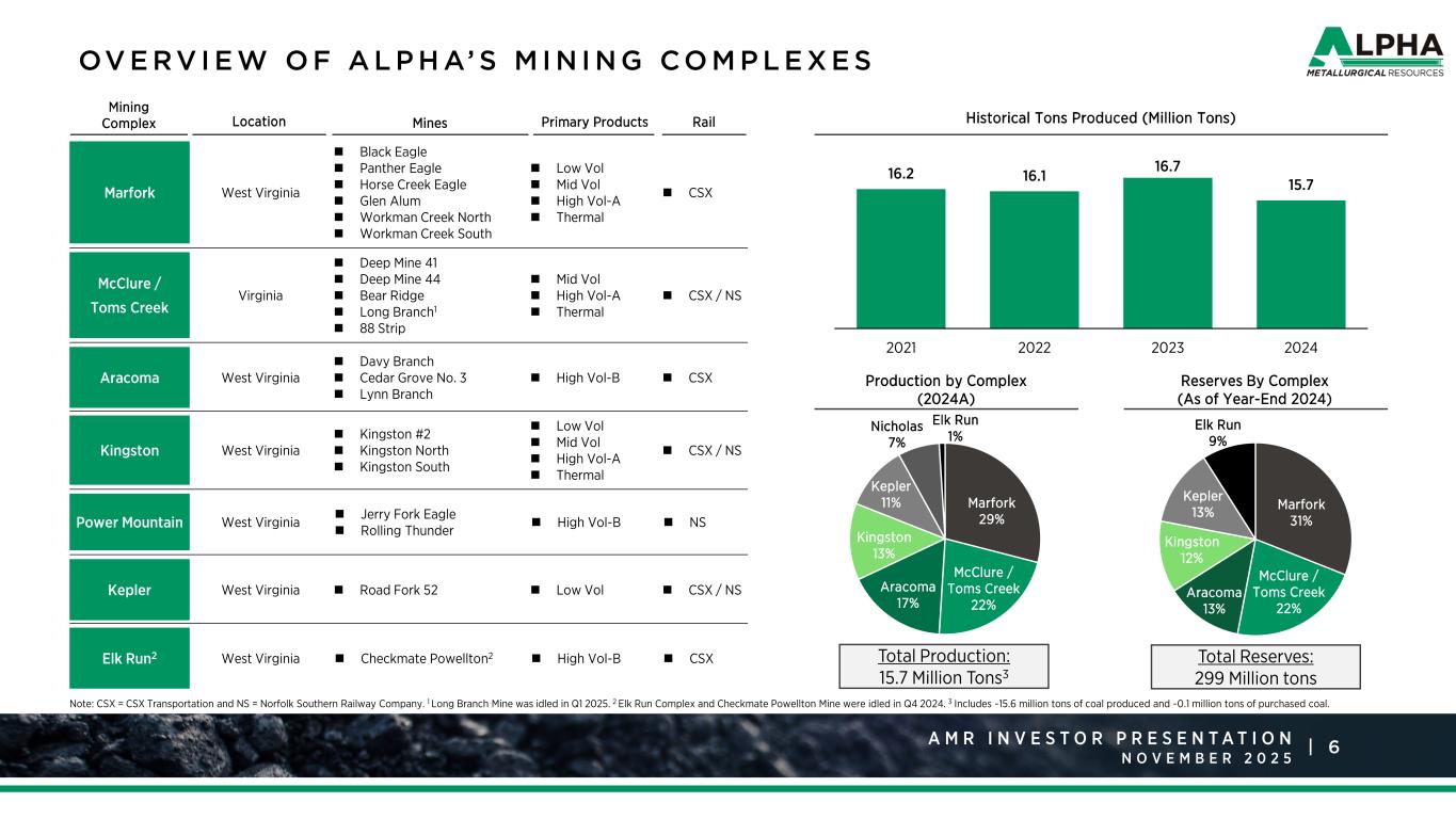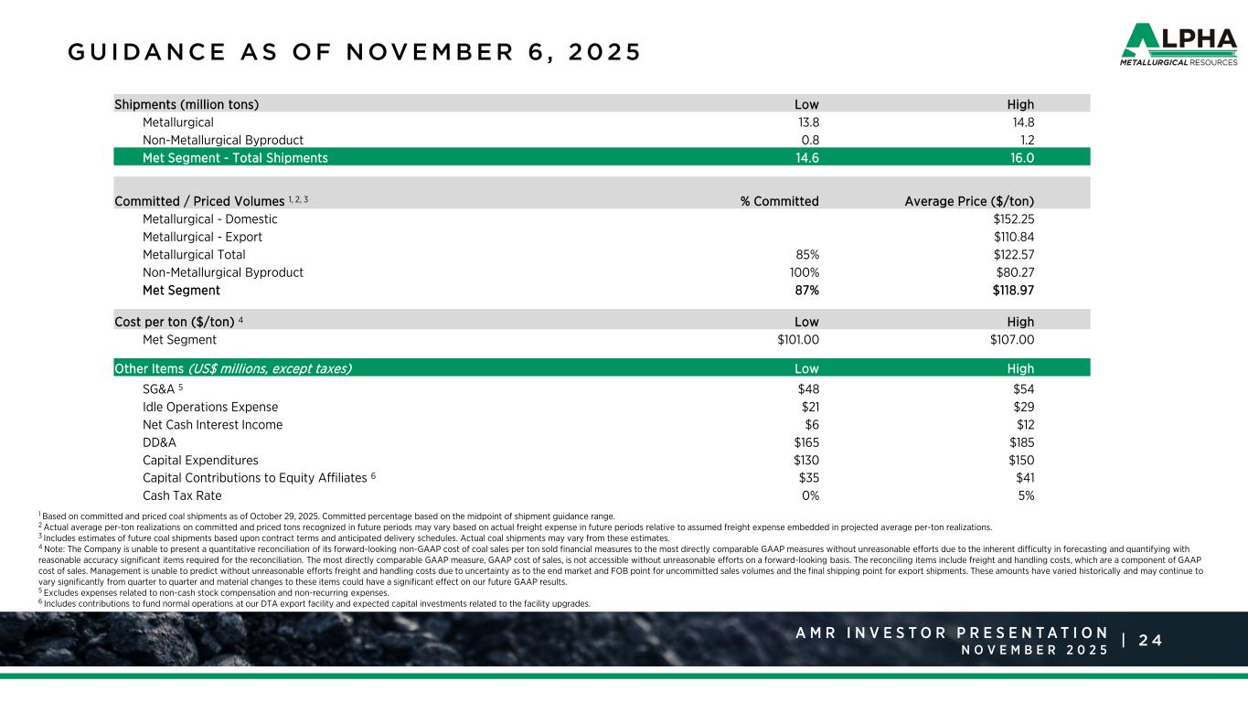 2 4A M R R a t i n g s A g e n c y P r e s e n t a t i o n J a n u a r y 2 0 2 5 |A M R I N V E S T O R P R E S E N T A T I O N N O V E M B E R 1 Based on committed and priced coal shipments as of October 29, 2025. Committed percentage based on the midpoint of shipment guidance range. 2 Actual average per-ton realizations on committed and priced tons recognized in future periods may vary based on actual freight expense in future periods relative to assumed freight expense embedded in projected average per-ton realizations. 3 Includes estimates of future coal shipments based upon contract terms and anticipated delivery schedules. Actual coal shipments may vary from these estimates. 4 Note: The Company is unable to present a quantitative reconciliation of its forward-looking non-GAAP cost of coal sales per ton sold financial measures to the most directly comparable GAAP measures without unreasonable efforts due to the inherent difficulty in forecasting and quantifying with reasonable accuracy significant items required for the reconciliation. The most directly comparable GAAP measure, GAAP cost of sales, is not accessible without unreasonable efforts on a forward-looking basis. The reconciling items include freight and handling costs, which are a component of GAAP cost of sales. Management is unable to predict without unreasonable efforts freight and handling costs due to uncertainty as to the end market and FOB point for uncommitted sales volumes and the final shipping point for export shipments. These amounts have varied historically and may continue to vary significantly from quarter to quarter and material changes to these items could have a significant effect on our future GAAP results. 5 Excludes expenses related to non-cash stock compensation and non-recurring expenses. 6 Includes contributions to fund normal operations at our DTA export facility and expected capital investments related to the facility upgrades. G U I DA N C E A S O F N OV E M B E R 6 , 2 0 2 5 Shipments (million tons) Low High Metallurgical 13.8 14.8 Non-Metallurgical Byproduct 0.8 1.2 Met Segment - Total Shipments 14.6 16.0 Committed / Priced Volumes 1, 2, 3 % Committed Average Price ($/ton) Metallurgical - Domestic $152.25 Metallurgical - Export $110.84 Metallurgical Total 85% $122.57 Non-Metallurgical Byproduct 100% $80.27 Met Segment 87% $118.97 Cost per ton ($/ton) 4 Low High Met Segment $101.00 $107.00 Other Items (US$ millions, except taxes) Low High SG&A 5 $48 $54 Idle Operations Expense $21 $29 Net Cash Interest Income $6 $12 DD&A $165 $185 Capital Expenditures $130 $150 Capital Contributions to Equity Affiliates 6 $35 $41 Cash Tax Rate 0% 5%