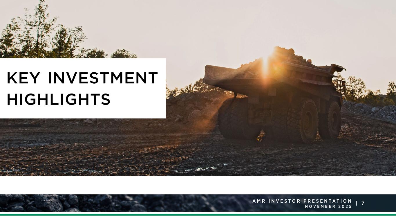 1 4A M R R a t i n g s A g e n c y P r e s e n t a t i o n J a n u a r y 2 0 2 5 |A M R I N V E S T O R P R E S E N T A T I O N N O V E M B E R S T R O N G C U LT U R E O F C O M M I T M E N T T O S A F E T Y, E N V I R O N M E N TA L S T E WA R D S H I P, A N D C O N T I N U O U S I M P R O V E M E N T6 Environmental • Environmental Management Systems • Water Management Systems • Waste Management Systems • Biodiversity Control • “Beyond Compliance” Attitude Social • Safety and Health • Workforce and Operations • Community Involvement • Code of Ethics and Responsibility Governance • Rigorous reporting and documentation standards • Strategic shift away from thermal coal Environmental Awards & Recognition 2024 Best Reclaimed Underground Mine 2023 Exemplary Reclamation of Surface Mining 2023 Exemplary Reclamation of Underground Mining 2023 Best AML Dangerous Highwall Elimination 2022 Underground Reclamation Award 2022 Drainage Control award Outstanding Employee Relations Experienced Leadership Driving Growth Safety performance is ~43% better than industry average1 Competitive compensation and benefits package Equal opportunity employer Strict anti-harassment and anti-discrimination policies 85% workforce retention in 2024 Combined 100+ years of experience across the coal and financial industries 83% Board independence 33% Board gender diversity Average director age of 58 years Average board tenure of 3 years Note: 1 Represents 2023 – 2025 YTD average Non-Fatal Days Lost for Alpha of 1.25 vs. 2.21 for the coal industry average.