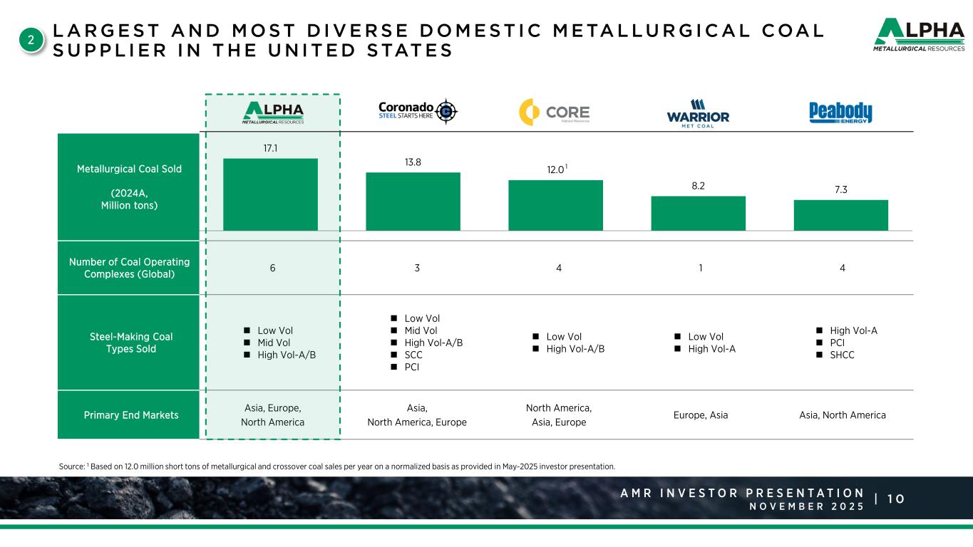 8A M R R a t i n g s A g e n c y P r e s e n t a t i o n J a n u a r y 2 0 2 5 |A M R I N V E S T O R P R E S E N T A T I O N N O V E M B E R K E Y I N V E S T M E N T H I G H L I G H T S Strategically Located Assets With Ability to Serve Both Domestic and Export Markets Experienced Management Team With Deep Industry Expertise and Familiarity With Alpha’s Asset Base Largest and Most Diverse Domestic Metallurgical Coal Supplier in the United States Outlook for Metallurgical Coal Remains Robust With Strong Long-Term Demand and Limited New Supply Flexible Cost Structure Enables Resilience Through the Commodity Price Cycle Strong Culture of Commitment to Safety, Environmental Stewardship, and Continuous Improvement Disciplined Capital Return Policy With Proven Ability to Adjust to Market Dynamics 4 1 2 3 5 6 7