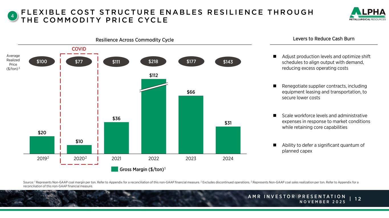 1 8A M R R a t i n g s A g e n c y P r e s e n t a t i o n J a n u a r y 2 0 2 5 |A M R I N V E S T O R P R E S E N T A T I O N N O V E M B E R Q4’21 Q1’22 Q2’22 Q3’22 Q4’22 Q1’23 Q2’23 Q3’23 Q4’23 Q1’24 Q2’24 Q3’24 Q4’24 Q1’25 Q2’25 Q3’25 Net Leverage3 0.7x 0.1x (0.1)x (0.2)x (0.2)x (0.1)x (0.3)x (0.3)x (0.2)x (0.3)x (0.5)x (0.8)x (1.2)x (2.0)x (2.9)x (2.8)x Gross Leverage4 0.8x 0.3x 0.0x 0.0x 0.0x 0.0x 0.0x 0.0x 0.0x 0.0x 0.0x 0.0x 0.0x 0.0x 0.0x 0.0x S T R O N G C AS H F LOW G E N E R AT I O N T H R O U G H VO L AT I L E M A R K E T S Net Leverage and Gross Leverage Over Time 1 Represents the last twelve months of Free Cash Flow. Refer to Appendix for a reconciliation of this non-GAAP financial measure. 2 Based on Wood Mackenzie Queensland HCC Benchmark in Real 2025 US$/tonne. 3 Represents Net Leverage. Refer to Appendix for a reconciliation of this non-GAAP financial measure. 4 Represents Gross Leverage. Refer to Appendix for a reconciliation of this non-GAAP financial measure. Consistently delivered strong operating and financial performance while maintaining a conservative balance sheet throughout market cycles $85 $429 $874 $1,261 $1,300 $1,091 $927 $564 $575 $604 $418 $473 $349 $198 $134 $3 $0 $100 $200 $300 $400 $500 $600 $700 $0 $300 $600 $900 $1,200 $1,500 Q4'21 Q1'22 Q2'22 Q3'22 Q4'22 Q1'23 Q2'23 Q3'23 Q4'23 Q1'24 Q2'24 Q3'24 Q4'24 Q1'25 Q2'25 Q3'25 H is to ric al M et C oa l S po t P ric e ($ /M et ric T on ne ) Fr ee C as h Fl ow (U S$ m m ) LTM FCF Historical HCC Spot Price1 2