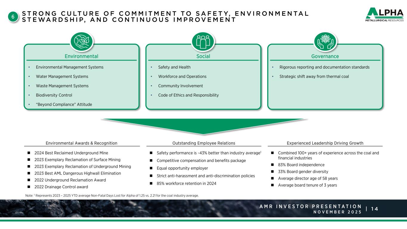 5A M R R a t i n g s A g e n c y P r e s e n t a t i o n J a n u a r y 2 0 2 5 |A M R I N V E S T O R P R E S E N T A T I O N N O V E M B E R S A F E T Y, E N V I R O N M E N TA L AWA R E N E S S A N D A C O M M I T M E N T T O C O N T I N U O U S I M P R O V E M E N T – E S S E N T I A L C O M P O N E N T S O F B U S I N E S S E X C E L L E N C E Note: 1 2025 YTD Data. See Appendix for additional detail on Alpha’s key safety statistics vs. the coal industry average. 2 Trees planted since 2016. ~24% Lower Total Reportable Incident Rate vs. Industry Avg.1 ~50% Lower Non-Fatal Days Lost vs. Industry Avg.1 37 2024 Safety & Mine Rescue Awards 5.3 Million Trees Planted2 25+ Environmental Compliance Awards 99.9%+ Water Quality Compliance Rate SAFE PRODUCTION We believe in operating safely and ethically. Every employee is empowered to eliminate at-risk behaviors. ENVIRONMENTAL STEWARDSHIP We conduct our mining business with a focus on environmental stewardship and a commitment to the protection of the environment.
