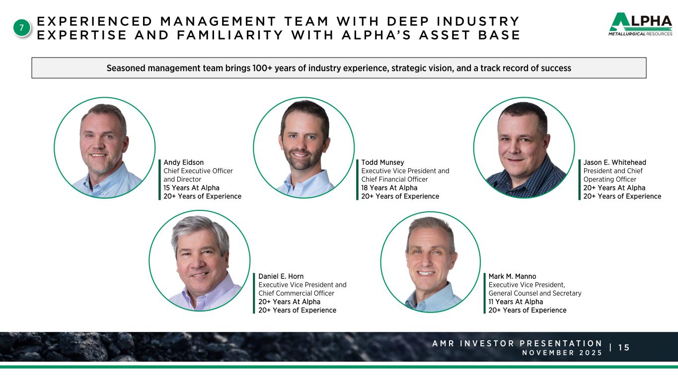 1 5A M R R a t i n g s A g e n c y P r e s e n t a t i o n J a n u a r y 2 0 2 5 |A M R I N V E S T O R P R E S E N T A T I O N N O V E M B E R E X P E R I E N C E D M A N AG E M E N T T E A M W I T H D E E P I N D U S T RY E X P E R T I S E A N D FA M I L I A R I T Y W I T H A L P H A’ S AS S E T B AS E 7 Seasoned management team brings 100+ years of industry experience, strategic vision, and a track record of success Daniel E. Horn Executive Vice President and Chief Commercial Officer 20+ Years At Alpha 20+ Years of Experience Mark M. Manno Executive Vice President, General Counsel and Secretary 11 Years At Alpha 20+ Years of Experience Andy Eidson Chief Executive Officer and Director 15 Years At Alpha 20+ Years of Experience Todd Munsey Executive Vice President and Chief Financial Officer 18 Years At Alpha 20+ Years of Experience Jason E. Whitehead President and Chief Operating Officer 20+ Years At Alpha 20+ Years of Experience