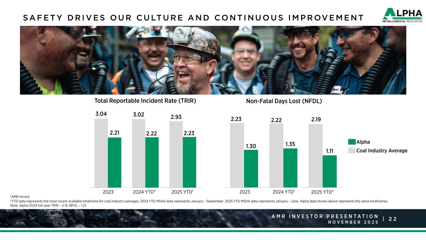2 2A M R R a t i n g s A g e n c y P r e s e n t a t i o n J a n u a r y 2 0 2 5 |A M R I N V E S T O R P R E S E N T A T I O N N O V E M B E R 3.04 3.02 2.93 2.21 2.22 2.23 2023 2024 YTD1* 2025 YTD1 Coal Industry Average Total Reportable Incident Rate (TRIR) 2.23 2.22 2.19 1.30 1.35 1.11 2023 2024 YTD1 2025 YTD1* Non-Fatal Days Lost (NFDL) S A F E T Y D R I V E S O U R C U LT U R E A N D CO N T I N U O U S I M P R OV E M E N T Alpha 1 YTD data represents the most recent available timeframe for coal industry averages; 2024 YTD MSHA data represents January – September. 2025 YTD MSHA data represents January – June. Alpha data shown above represents the same timeframes. Note: Alpha 2024 full-year TRIR – 2.15, NFDL – 1.21. *AMR record