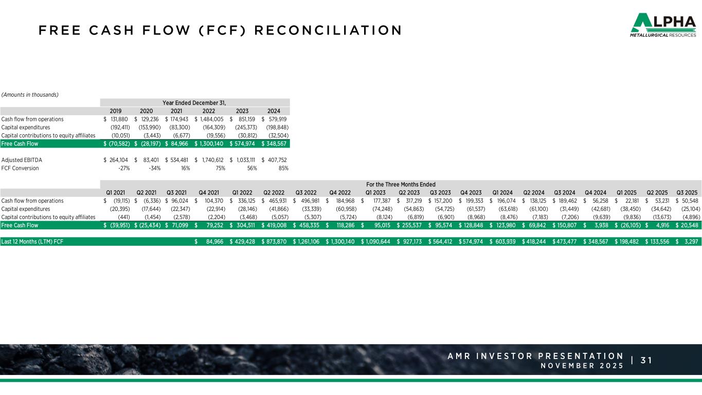 3 1A M R R a t i n g s A g e n c y P r e s e n t a t i o n J a n u a r y 2 0 2 5 |A M R I N V E S T O R P R E S E N T A T I O N N O V E M B E R F R E E C AS H F LOW ( F C F ) R E CO N C I L I AT I O N (Amounts in thousands) 2019 2020 2021 2022 2023 2024 Cash flow from operations 131,880$ 129,236$ 174,943$ 1,484,005$ 851,159$ 579,919$ Capital expenditures (192,411) (153,990) (83,300) (164,309) (245,373) (198,848) Capital contributions to equity affiliates (10,051) (3,443) (6,677) (19,556) (30,812) (32,504) Free Cash Flow (70,582)$ (28,197)$ 84,966$ 1,300,140$ 574,974$ 348,567$ Adjusted EBITDA 264,104$ 83,401$ 534,481$ 1,740,612$ 1,033,111$ 407,752$ FCF Conversion -27% -34% 16% 75% 56% 85% Q1 2021 Q2 2021 Q3 2021 Q4 2021 Q1 2022 Q2 2022 Q3 2022 Q4 2022 Q1 2023 Q2 2023 Q3 2023 Q4 2023 Q1 2024 Q2 2024 Q3 2024 Q4 2024 Q1 2025 Q2 2025 Q3 2025 Cash flow from operations (19,115)$ (6,336)$ 96,024$ 104,370$ 336,125$ 465,931$ 496,981$ 184,968$ 177,387$ 317,219$ 157,200$ 199,353$ 196,074$ 138,125$ 189,462$ 56,258$ 22,181$ 53,231$ 50,548$ Capital expenditures (20,395) (17,644) (22,347) (22,914) (28,146) (41,866) (33,339) (60,958) (74,248) (54,863) (54,725) (61,537) (63,618) (61,100) (31,449) (42,681) (38,450) (34,642) (25,104) Capital contributions to equity affiliates (441) (1,454) (2,578) (2,204) (3,468) (5,057) (5,307) (5,724) (8,124) (6,819) (6,901) (8,968) (8,476) (7,183) (7,206) (9,639) (9,836) (13,673) (4,896) Free Cash Flow (39,951)$ (25,434)$ 71,099$ 79,252$ 304,511$ 419,008$ 458,335$ 118,286$ 95,015$ 255,537$ 95,574$ 128,848$ 123,980$ 69,842$ 150,807$ 3,938$ (26,105)$ 4,916$ 20,548$ Last 12 Months (LTM) FCF 84,966$ 429,428$ 873,870$ 1,261,106$ 1,300,140$ 1,090,644$ 927,173$ 564,412$ 574,974$ 603,939$ 418,244$ 473,477$ 348,567$ 198,482$ 133,556$ 3,297$ Year Ended December 31, For the Three Months Ended