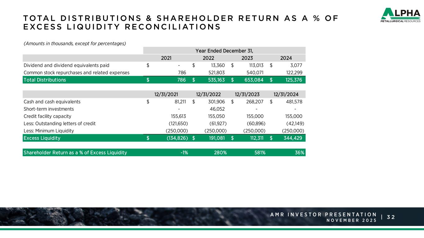 1 3A M R R a t i n g s A g e n c y P r e s e n t a t i o n J a n u a r y 2 0 2 5 |A M R I N V E S T O R P R E S E N T A T I O N N O V E M B E R $85 $1,300 $575 $349 $1 $535 $653 $125 2021A 2022A 2023A 2024A (U S$ in M ill io ns ) Free Cash Flow Distributions D I S C I P L I N E D C A P I TA L R E T U R N P O L I C Y W I T H P R OV E N A B I L I T Y TO A DJ U S T TO M A R K E T DY N A M I C S 5 1 Represents Free Cash Flow. Refer to Appendix for a reconciliation of this non-GAAP financial measure. 2 Represents Distributions. Refer to Appendix for a reconciliation of this non-GAAP financial measure. 3 Represents Shareholder Return as a % of Excess Liquidity. Refer to Appendix for a reconciliation of this non-GAAP financial measure. Alpha has focused its shareholder returns on share repurchases, which has been highly accretive for shareholders Management has calibrated shareholder return with Company’s free cash flow generation Share repurchases are the most flexible form of capital return and can be adjusted based on free cash flow generation Going forward, management expects to continue to align shareholder returns and cash generation to maintain a healthy balance sheet Key TakeawaysCapital Return Aligned to Free Cash Flow Generation NM 280% 581% 36% Shareholder Return as a % of Excess Liquidity 32 1