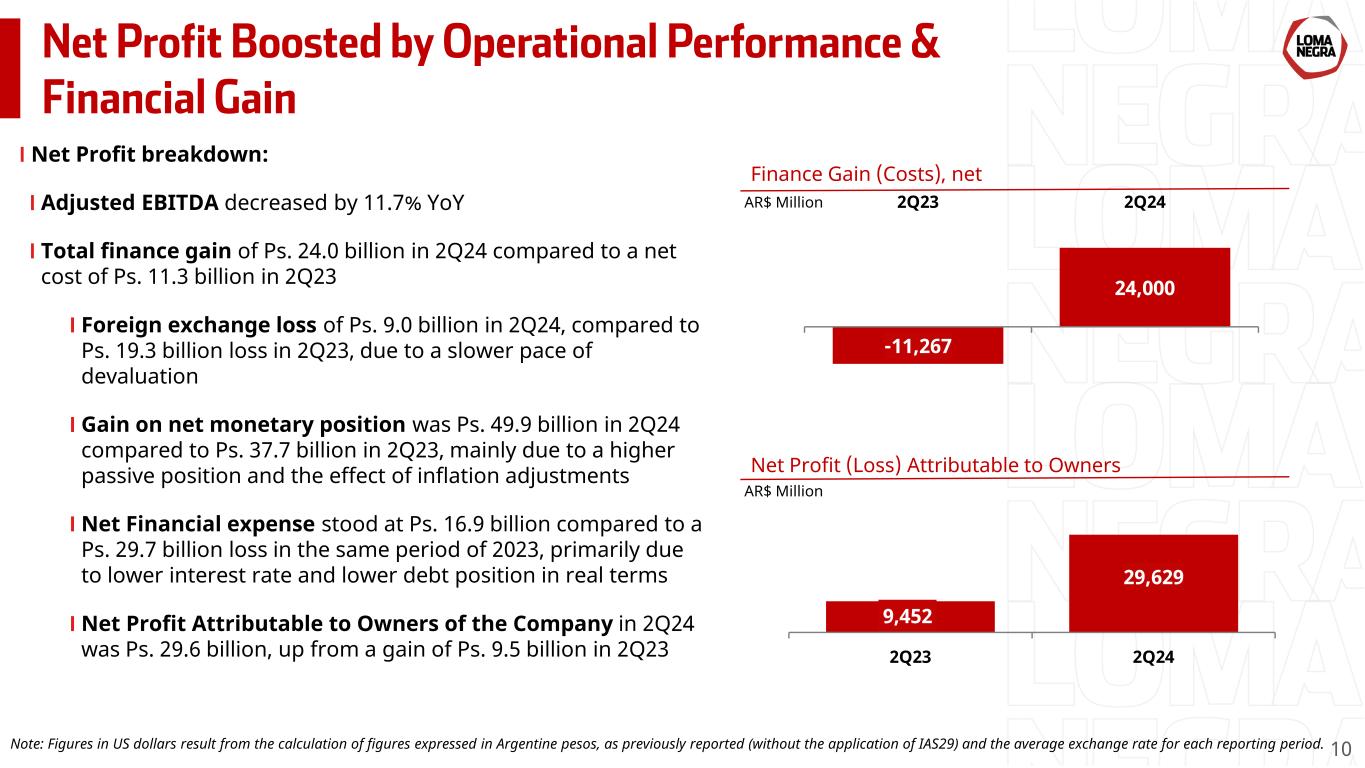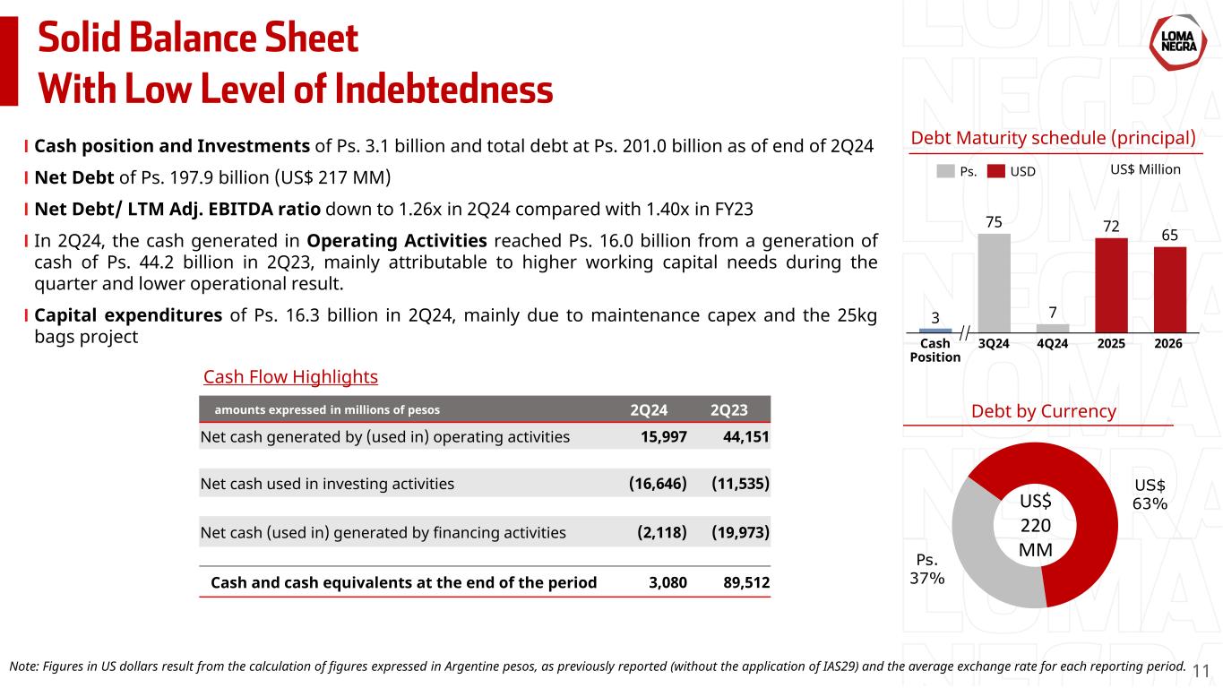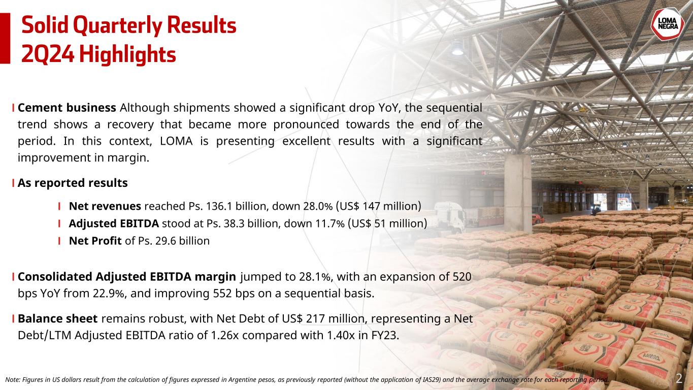 Solid Quarterly Results 2Q24 Highlights Cement business Although shipments showed a significant drop YoY, the sequential trend shows a recovery that became more pronounced towards the end of the period. In this context, LOMA is presenting excellent results with a significant improvement in margin. As reported results Net revenues reached Ps. 136.1 billion, down 28.0% (US$ 147 million) Adjusted EBITDA stood at Ps. 38.3 billion, down 11.7% (US$ 51 million) Net Profit of Ps. 29.6 billion Consolidated Adjusted EBITDA margin jumped to 28.1%, with an expansion of 520 bps YoY from 22.9%, and improving 552 bps on a sequential basis. Balance sheet remains robust, with Net Debt of US$ 217 million, representing a Net Debt/LTM Adjusted EBITDA ratio of 1.26x compared with 1.40x in FY23. Note: Figures in US dollars result from the calculation of figures expressed in Argentine pesos, as previously reported (without the application of IAS29) and the average exchange rate for each reporting period. 2