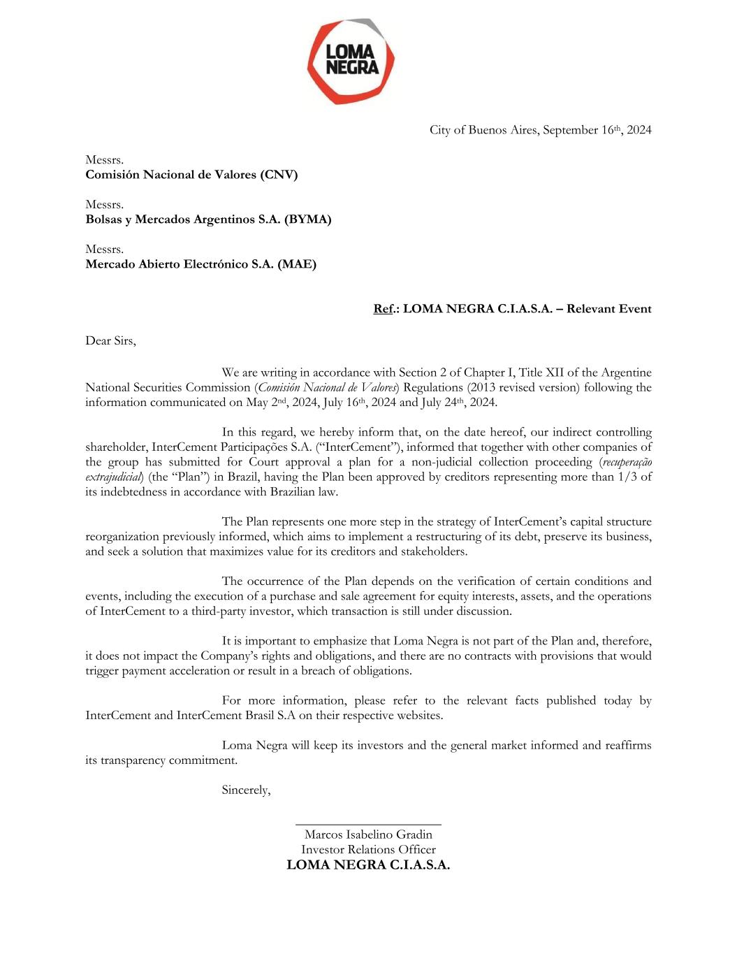 City of Buenos Aires, September 16th, 2024 Messrs. Comisión Nacional de Valores (CNV) Messrs. Bolsas y Mercados Argentinos S.A. (BYMA) Messrs. Mercado Abierto Electrónico S.A. (MAE) Ref.: LOMA NEGRA C.I.A.S.A. – Relevant Event Dear Sirs, We are writing in accordance with Section 2 of Chapter I, Title XII of the Argentine National Securities Commission (Comisión Nacional de Valores) Regulations (2013 revised version) following the information communicated on May 2nd, 2024, July 16th, 2024 and July 24th, 2024. In this regard, we hereby inform that, on the date hereof, our indirect controlling shareholder, InterCement Participações S.A. (“InterCement”), informed that together with other companies of the group has submitted for Court approval a plan for a non-judicial collection proceeding (recuperação extrajudicial) (the “Plan”) in Brazil, having the Plan been approved by creditors representing more than 1/3 of its indebtedness in accordance with Brazilian law. The Plan represents one more step in the strategy of InterCement’s capital structure reorganization previously informed, which aims to implement a restructuring of its debt, preserve its business, and seek a solution that maximizes value for its creditors and stakeholders. The occurrence of the Plan depends on the verification of certain conditions and events, including the execution of a purchase and sale agreement for equity interests, assets, and the operations of InterCement to a third-party investor, which transaction is still under discussion. It is important to emphasize that Loma Negra is not part of the Plan and, therefore, it does not impact the Company’s rights and obligations, and there are no contracts with provisions that would trigger payment acceleration or result in a breach of obligations. For more information, please refer to the relevant facts published today by InterCement and InterCement Brasil S.A on their respective websites. Loma Negra will keep its investors and the general market informed and reaffirms its transparency commitment. Sincerely, ______________________ Marcos Isabelino Gradin Investor Relations Officer LOMA NEGRA C.I.A.S.A.