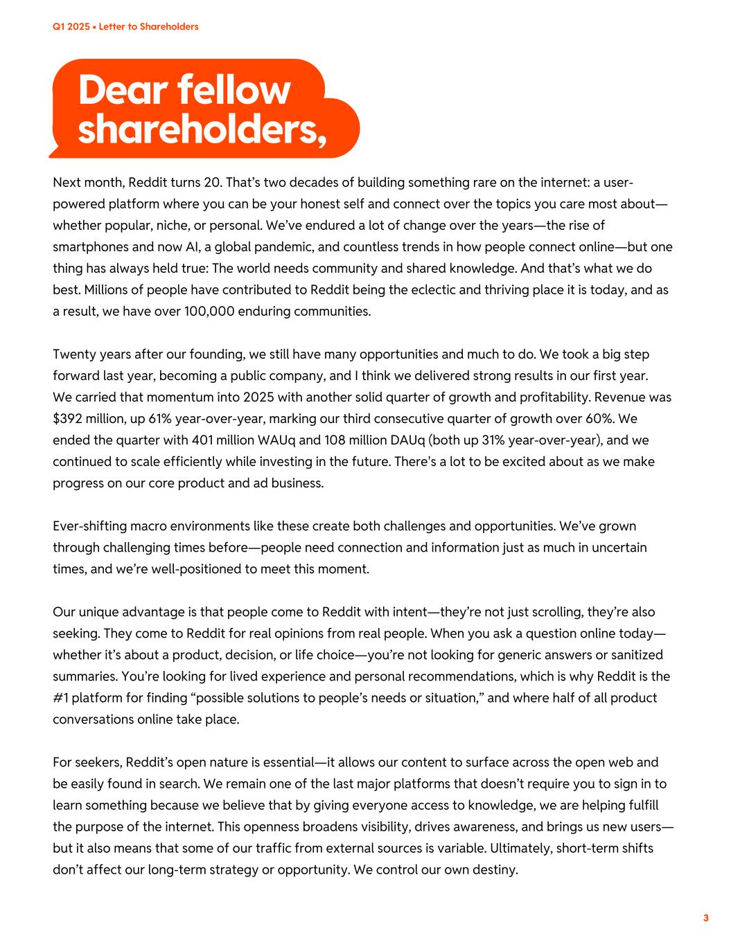 Dear fellow shareholders, Next month, Reddit turns 20. That’s two decades of building something rare on the internet: a user- powered platform where you can be your honest self and connect over the topics you care most about— whether popular, niche, or personal. We’ve endured a lot of change over the years—the rise of smartphones and now AI, a global pandemic, and countless trends in how people connect online—but one thing has always held true: The world needs community and shared knowledge. And that’s what we do best. Millions of people have contributed to Reddit being the eclectic and thriving place it is today, and as a result, we have over 100,000 enduring communities. Twenty years after our founding, we still have many opportunities and much to do. We took a big step forward last year, becoming a public company, and I think we delivered strong results in our first year. We carried that momentum into 2025 with another solid quarter of growth and profitability. Revenue was $392 million, up 61% year-over-year, marking our third consecutive quarter of growth over 60%. We ended the quarter with 401 million WAUq and 108 million DAUq (both up 31% year-over-year), and we continued to scale efficiently while investing in the future. There's a lot to be excited about as we make progress on our core product and ad business. Ever-shifting macro environments like these create both challenges and opportunities. We’ve grown through challenging times before—people need connection and information just as much in uncertain times, and we’re well-positioned to meet this moment. Our unique advantage is that people come to Reddit with intent—they’re not just scrolling, they’re also seeking. They come to Reddit for real opinions from real people. When you ask a question online today— whether it’s about a product, decision, or life choice—you’re not looking for generic answers or sanitized summaries. You’re looking for lived experience and personal recommendations, which is why Reddit is the #1 platform for finding “possible solutions to people’s needs or situation,” and where half of all product conversations online take place. For seekers, Reddit’s open nature is essential—it allows our content to surface across the open web and be easily found in search. We remain one of the last major platforms that doesn’t require you to sign in to learn something because we believe that by giving everyone access to knowledge, we are helping fulfill the purpose of the internet. This openness broadens visibility, drives awareness, and brings us new users— but it also means that some of our traffic from external sources is variable. Ultimately, short-term shifts don’t affect our long-term strategy or opportunity. We control our own destiny. Q1 2025 • Letter to Shareholders 3