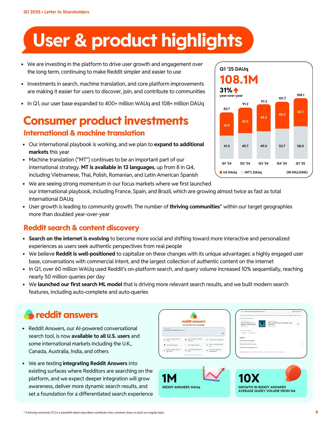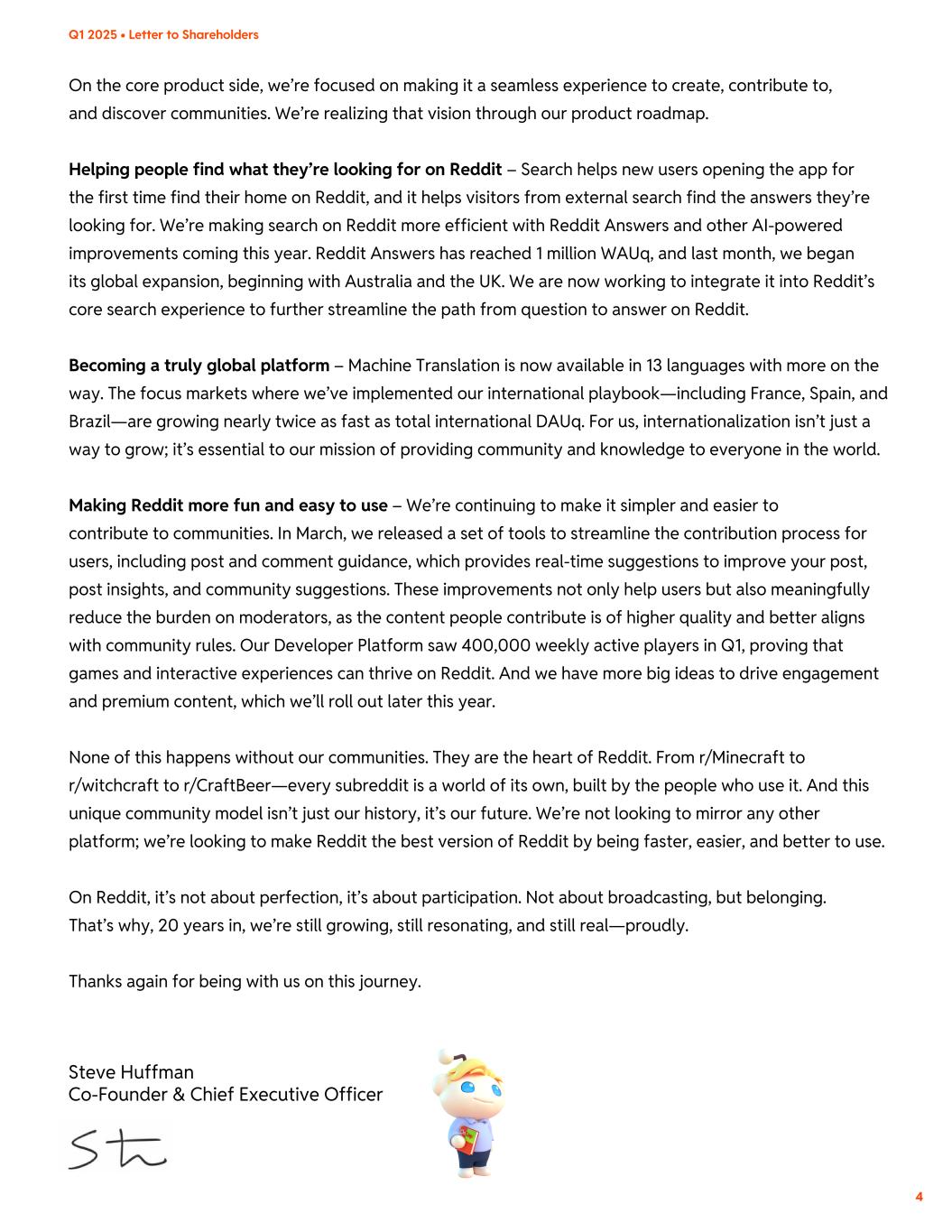On the core product side, we’re focused on making it a seamless experience to create, contribute to, and discover communities. We’re realizing that vision through our product roadmap. Helping people find what they’re looking for on Reddit – Search helps new users opening the app for the first time find their home on Reddit, and it helps visitors from external search find the answers they’re looking for. We’re making search on Reddit more efficient with Reddit Answers and other AI-powered improvements coming this year. Reddit Answers has reached 1 million WAUq, and last month, we began its global expansion, beginning with Australia and the UK. We are now working to integrate it into Reddit’s core search experience to further streamline the path from question to answer on Reddit. Becoming a truly global platform – Machine Translation is now available in 13 languages with more on the way. The focus markets where we’ve implemented our international playbook—including France, Spain, and Brazil—are growing nearly twice as fast as total international DAUq. For us, internationalization isn’t just a way to grow; it’s essential to our mission of providing community and knowledge to everyone in the world. Making Reddit more fun and easy to use – We’re continuing to make it simpler and easier to contribute to communities. In March, we released a set of tools to streamline the contribution process for users, including post and comment guidance, which provides real-time suggestions to improve your post, post insights, and community suggestions. These improvements not only help users but also meaningfully reduce the burden on moderators, as the content people contribute is of higher quality and better aligns with community rules. Our Developer Platform saw 400,000 weekly active players in Q1, proving that games and interactive experiences can thrive on Reddit. And we have more big ideas to drive engagement and premium content, which we’ll roll out later this year. None of this happens without our communities. They are the heart of Reddit. From r/Minecraft to r/witchcraft to r/CraftBeer—every subreddit is a world of its own, built by the people who use it. And this unique community model isn’t just our history, it’s our future. We’re not looking to mirror any other platform; we’re looking to make Reddit the best version of Reddit by being faster, easier, and better to use. On Reddit, it’s not about perfection, it’s about participation. Not about broadcasting, but belonging. That’s why, 20 years in, we’re still growing, still resonating, and still real—proudly. Thanks again for being with us on this journey. Steve Huffman Co-Founder & Chief Executive Officer Q1 2025 • Letter to Shareholders 4