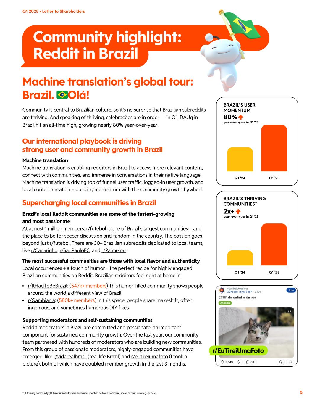 Community highlight: Reddit in Brazil Q1 2025 • Letter to Shareholders 80% 2x+ BRAZIL’S USER MOMENTUM year-over-year in Q1 ‘25 BRAZIL’S THRIVING COMMUNITIES* year-over-year in Q1 ‘25Brazil’s local Reddit communities are some of the fastest-growing and most passionate At almost 1 million members, r/futebol is one of Brazil’s largest communities – and the place to be for soccer discussion and fandom in the country. The passion goes beyond just r/futebol. There are 30+ Brazilian subreddits dedicated to local teams, like r/Canarinho, r/SauPauloFC, and r/Palmeiras. The most successful communities are those with local flavor and authenticity Local occurrences + a touch of humor = the perfect recipe for highly engaged Brazilian communities on Reddit. Brazilian redditors feel right at home in: r/ItHadToBeBrazil: (547k+ members) This humor-filled community shows people around the world a different view of Brazil r/Gambiarra: (580k+ members) In this space, people share makeshift, often ingenious, and sometimes humorous DIY fixes Machine translation Machine translation is enabling redditors in Brazil to access more relevant content, connect with communities, and immerse in conversations in their native language. Machine translation is driving top of funnel user traffic, logged-in user growth, and local content creation – building momentum with the community growth flywheel. Community is central to Brazilian culture, so it’s no surprise that Brazilian subreddits are thriving. And speaking of thriving, celebrações are in order — in Q1, DAUq in Brazil hit an all-time high, growing nearly 80% year-over-year. Supporting moderators and self-sustaining communities Reddit moderators in Brazil are committed and passionate, an important component for sustained community growth. Over the last year, our community team partnered with hundreds of moderators who are building new communities. From this group of passionate moderators, highly-engaged communities have emerged, like r/vidarealbrasil (real life Brazil) and r/eutireiumafoto (I took a picture), both of which have doubled member growth in the last 3 months. * A thriving community (TC) is a subreddit where subscribers contribute (vote, comment, share, or post) on a regular basis. 5 Machine translation’s global tour: Brazil. Olá! Our international playbook is driving strong user and community growth in Brazil Supercharging local communities in Brazil Q1 ‘24 Q1 ‘24 Q1 '25 Q1 '25