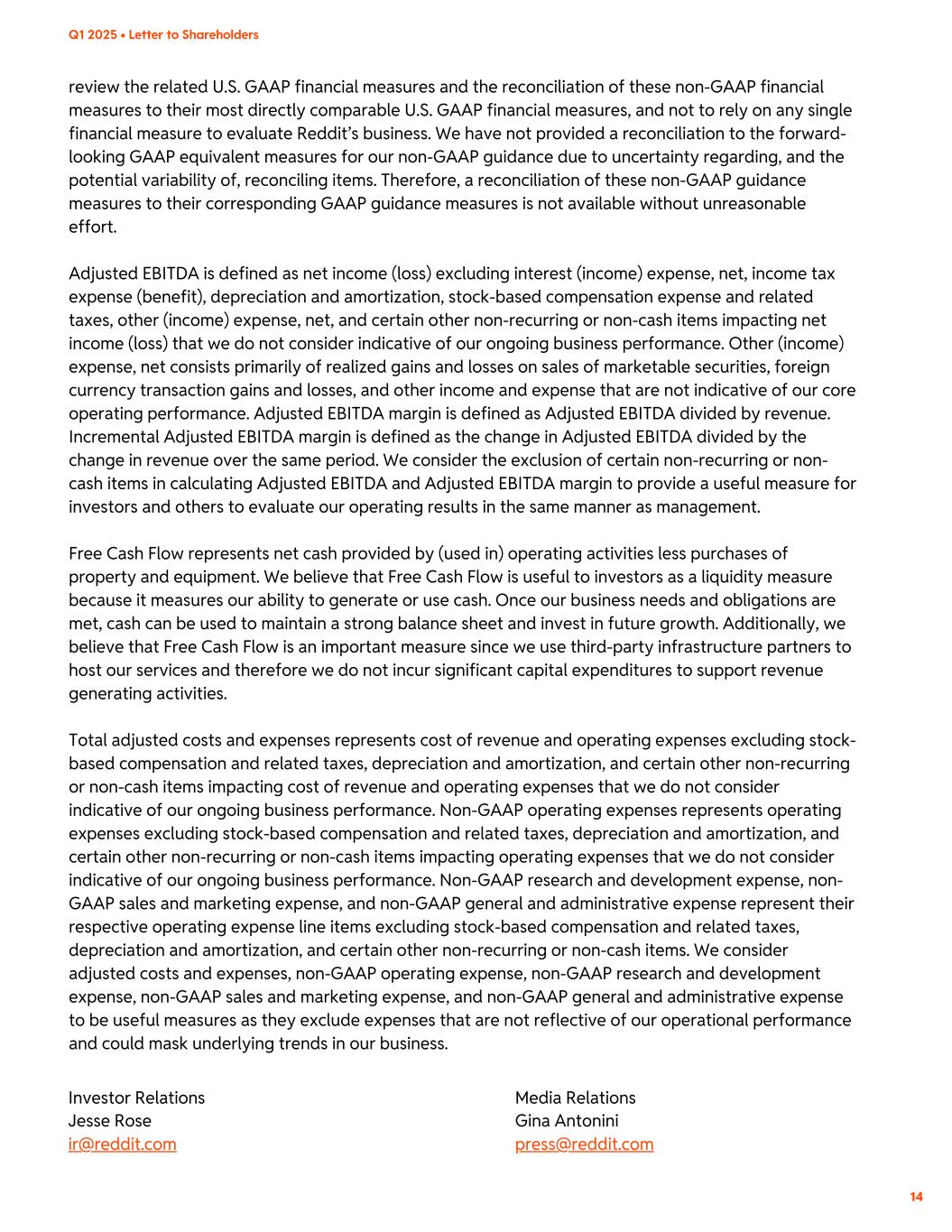 review the related U.S. GAAP financial measures and the reconciliation of these non-GAAP financial measures to their most directly comparable U.S. GAAP financial measures, and not to rely on any single financial measure to evaluate Reddit’s business. We have not provided a reconciliation to the forward- looking GAAP equivalent measures for our non-GAAP guidance due to uncertainty regarding, and the potential variability of, reconciling items. Therefore, a reconciliation of these non-GAAP guidance measures to their corresponding GAAP guidance measures is not available without unreasonable effort. Adjusted EBITDA is defined as net income (loss) excluding interest (income) expense, net, income tax expense (benefit), depreciation and amortization, stock-based compensation expense and related taxes, other (income) expense, net, and certain other non-recurring or non-cash items impacting net income (loss) that we do not consider indicative of our ongoing business performance. Other (income) expense, net consists primarily of realized gains and losses on sales of marketable securities, foreign currency transaction gains and losses, and other income and expense that are not indicative of our core operating performance. Adjusted EBITDA margin is defined as Adjusted EBITDA divided by revenue. Incremental Adjusted EBITDA margin is defined as the change in Adjusted EBITDA divided by the change in revenue over the same period. We consider the exclusion of certain non-recurring or non- cash items in calculating Adjusted EBITDA and Adjusted EBITDA margin to provide a useful measure for investors and others to evaluate our operating results in the same manner as management. Free Cash Flow represents net cash provided by (used in) operating activities less purchases of property and equipment. We believe that Free Cash Flow is useful to investors as a liquidity measure because it measures our ability to generate or use cash. Once our business needs and obligations are met, cash can be used to maintain a strong balance sheet and invest in future growth. Additionally, we believe that Free Cash Flow is an important measure since we use third-party infrastructure partners to host our services and therefore we do not incur significant capital expenditures to support revenue generating activities. Total adjusted costs and expenses represents cost of revenue and operating expenses excluding stock- based compensation and related taxes, depreciation and amortization, and certain other non-recurring or non-cash items impacting cost of revenue and operating expenses that we do not consider indicative of our ongoing business performance. Non-GAAP operating expenses represents operating expenses excluding stock-based compensation and related taxes, depreciation and amortization, and certain other non-recurring or non-cash items impacting operating expenses that we do not consider indicative of our ongoing business performance. Non-GAAP research and development expense, non- GAAP sales and marketing expense, and non-GAAP general and administrative expense represent their respective operating expense line items excluding stock-based compensation and related taxes, depreciation and amortization, and certain other non-recurring or non-cash items. We consider adjusted costs and expenses, non-GAAP operating expense, non-GAAP research and development expense, non-GAAP sales and marketing expense, and non-GAAP general and administrative expense to be useful measures as they exclude expenses that are not reflective of our operational performance and could mask underlying trends in our business. Investor Relations Jesse Rose ir@reddit.com Media Relations Gina Antonini press@reddit.com Q1 2025 • Letter to Shareholders 14