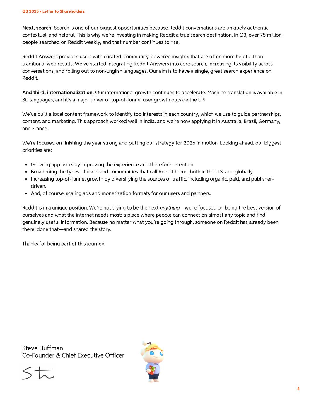 Next, search: Search is one of our biggest opportunities because Reddit conversations are uniquely authentic, contextual, and helpful. This is why we’re investing in making Reddit a true search destination. In Q3, over 75 million people searched on Reddit weekly, and that number continues to rise. Reddit Answers provides users with curated, community-powered insights that are often more helpful than traditional web results. We’ve started integrating Reddit Answers into core search, increasing its visibility across conversations, and rolling out to non-English languages. Our aim is to have a single, great search experience on Reddit. And third, internationalization: Our international growth continues to accelerate. Machine translation is available in 30 languages, and it’s a major driver of top-of-funnel user growth outside the U.S. We’ve built a local content framework to identify top interests in each country, which we use to guide partnerships, content, and marketing. This approach worked well in India, and we’re now applying it in Australia, Brazil, Germany, and France. We’re focused on finishing the year strong and putting our strategy for 2026 in motion. Looking ahead, our biggest priorities are: Growing app users by improving the experience and therefore retention. Broadening the types of users and communities that call Reddit home, both in the U.S. and globally. Increasing top-of-funnel growth by diversifying the sources of traffic, including organic, paid, and publisher- driven. And, of course, scaling ads and monetization formats for our users and partners. Reddit is in a unique position. We’re not trying to be the next anything—we’re focused on being the best version of ourselves and what the internet needs most: a place where people can connect on almost any topic and find genuinely useful information. Because no matter what you’re going through, someone on Reddit has already been there, done that—and shared the story. Thanks for being part of this journey. Steve Huffman Co-Founder & Chief Executive Officer 4 Q3 2025 • Letter to Shareholders