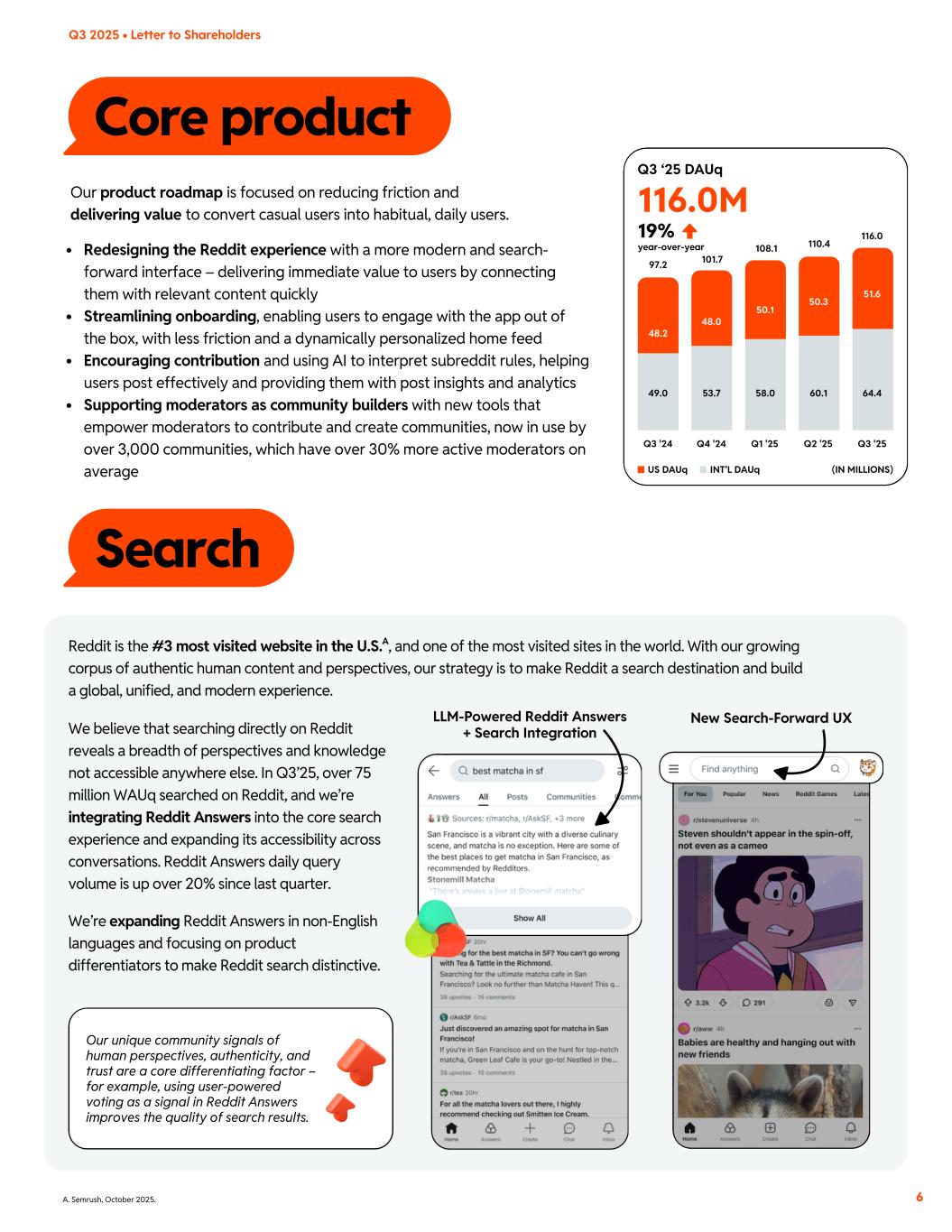 Core product year-over-year US DAUq INT’L DAUq 116.0M 19% Our unique community signals of human perspectives, authenticity, and trust are a core differentiating factor – for example, using user-powered voting as a signal in Reddit Answers improves the quality of search results. LLM-Powered Reddit Answers + Search Integration Search New Search-Forward UX Redesigning the Reddit experience with a more modern and search- forward interface – delivering immediate value to users by connecting them with relevant content quickly Streamlining onboarding, enabling users to engage with the app out of the box, with less friction and a dynamically personalized home feed Encouraging contribution and using AI to interpret subreddit rules, helping users post effectively and providing them with post insights and analytics Supporting moderators as community builders with new tools that empower moderators to contribute and create communities, now in use by over 3,000 communities, which have over 30% more active moderators on average (IN MILLIONS) Q2 '25Q3 '24 Q4 '24 Q1 '25 Q3 '25 64.449.0 53.7 58.0 60.1 Our product roadmap is focused on reducing friction and delivering value to convert casual users into habitual, daily users. 51.6 48.2 48.0 50.1 50.3 116.0 97.2 101.7 108.1 110.4 Q3 ‘25 DAUq 6 Q3 2025 • Letter to Shareholders A. Semrush, October 2025. We believe that searching directly on Reddit reveals a breadth of perspectives and knowledge not accessible anywhere else. In Q3’25, over 75 million WAUq searched on Reddit, and we’re integrating Reddit Answers into the core search experience and expanding its accessibility across conversations. Reddit Answers daily query volume is up over 20% since last quarter. We’re expanding Reddit Answers in non-English languages and focusing on product differentiators to make Reddit search distinctive. Reddit is the #3 most visited website in the U.S. , and one of the most visited sites in the world. With our growing corpus of authentic human content and perspectives, our strategy is to make Reddit a search destination and build a global, unified, and modern experience. A