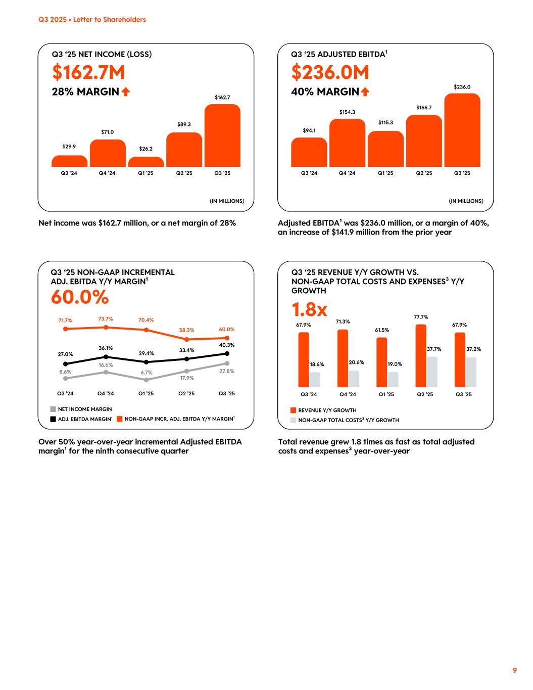 40% MARGIN28% MARGIN $236.0M 1.8x $162.7M 60.0% Q3 ‘25 NET INCOME (LOSS) Q4 '24 Q1 '25 Q2 '25 Q3 '25Q3 '24 (IN MILLIONS) Net income was $162.7 million, or a net margin of 28% $26.2 $162.7 $29.9 $71.0 $89.3 NON-GAAP TOTAL COSTS³ Y/Y GROWTH REVENUE Y/Y GROWTH Total revenue grew 1.8 times as fast as total adjusted costs and expenses³ year-over-year 67.9% 18.6% 71.3% 20.6% 61.5% 19.0% 77.7% 37.7% 67.9% 37.2% Q3 ‘25 REVENUE Y/Y GROWTH VS. NON-GAAP TOTAL COSTS AND EXPENSES³ Y/Y GROWTH Q4 '24 Q1 '25 Q2 '25 Q3 '25Q3 '24 Q3 ‘25 ADJUSTED EBITDA¹ Q4 '24 Q1 '25 Q2 '25 Q3 '25Q3 '24 (IN MILLIONS) Adjusted EBITDA¹ was $236.0 million, or a margin of 40%, an increase of $141.9 million from the prior year $94.1 $236.0 $154.3 $115.3 $166.7 Over 50% year-over-year incremental Adjusted EBITDA margin¹ for the ninth consecutive quarter 71.7% 27.0% 73.7% 36.1% 8.6% 16.6% 29.4% 6.7% 58.3% 33.4% 17.9% 70.4% 60.0% 40.3% 27.8% Q3 ‘25 NON-GAAP INCREMENTAL ADJ. EBITDA Y/Y MARGIN¹ NON-GAAP INCR. ADJ. EBITDA Y/Y MARGIN¹ NET INCOME MARGIN Q3 '25 ADJ. EBITDA MARGIN1 Q2 '25Q1 '25Q4 '24Q3 '24 9 Q3 2025 • Letter to Shareholders