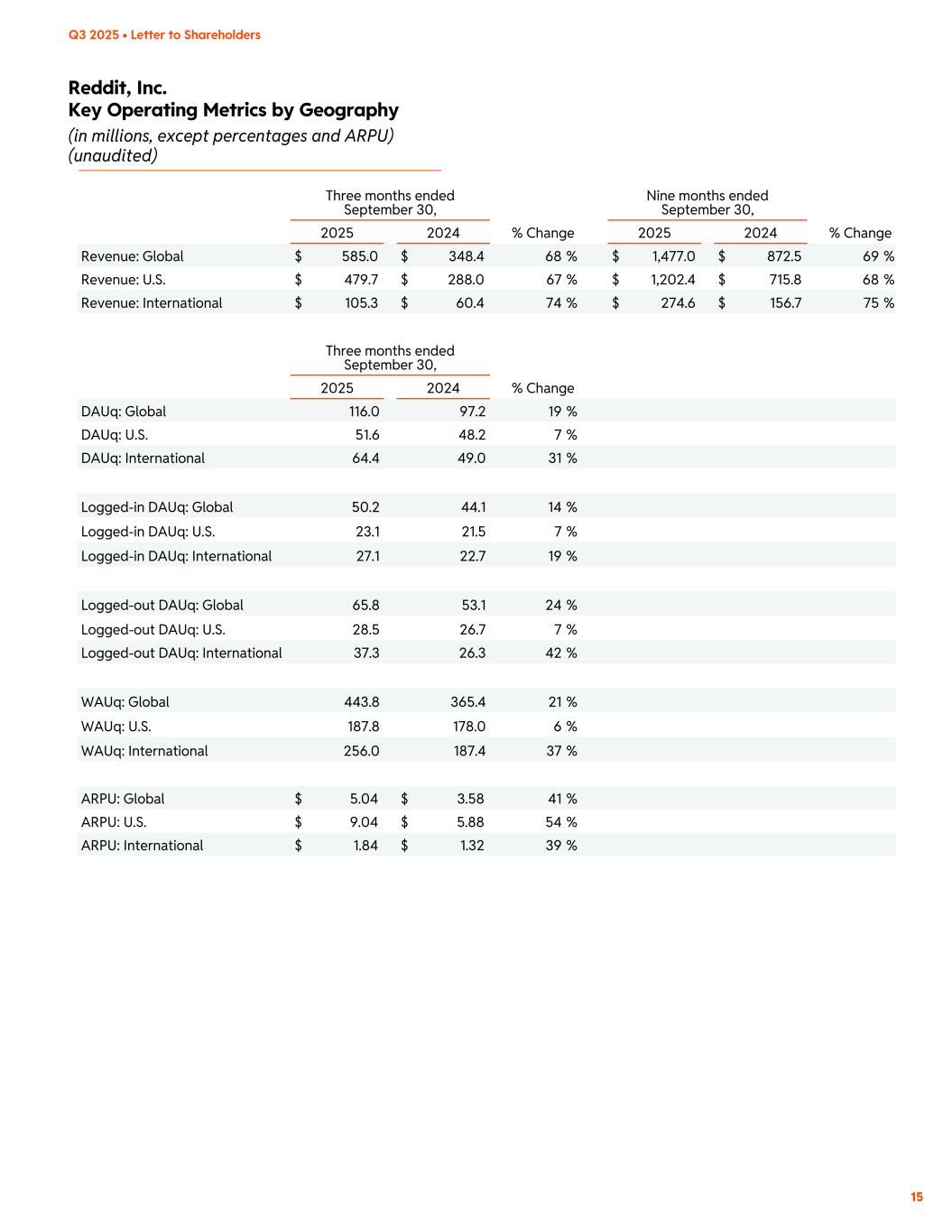 Reddit, Inc. Key Operating Metrics by Geography (in millions, except percentages and ARPU) (unaudited) 15 Q3 2025 • Letter to Shareholders Three months ended September 30, Nine months ended September 30, 2025 2024 % Change 2025 2024 % Change Revenue: Global $ 585.0 $ 348.4 68 % $ 1,477.0 $ 872.5 69 % Revenue: U.S. $ 479.7 $ 288.0 67 % $ 1,202.4 $ 715.8 68 % Revenue: International $ 105.3 $ 60.4 74 % $ 274.6 $ 156.7 75 % Three months ended September 30, 2025 2024 % Change DAUq: Global 116.0 97.2 19 % DAUq: U.S. 51.6 48.2 7 % DAUq: International 64.4 49.0 31 % Logged-in DAUq: Global 50.2 44.1 14 % Logged-in DAUq: U.S. 23.1 21.5 7 % Logged-in DAUq: International 27.1 22.7 19 % Logged-out DAUq: Global 65.8 53.1 24 % Logged-out DAUq: U.S. 28.5 26.7 7 % Logged-out DAUq: International 37.3 26.3 42 % WAUq: Global 443.8 365.4 21 % WAUq: U.S. 187.8 178.0 6 % WAUq: International 256.0 187.4 37 % ARPU: Global $ 5.04 $ 3.58 41 % ARPU: U.S. $ 9.04 $ 5.88 54 % ARPU: International $ 1.84 $ 1.32 39 %