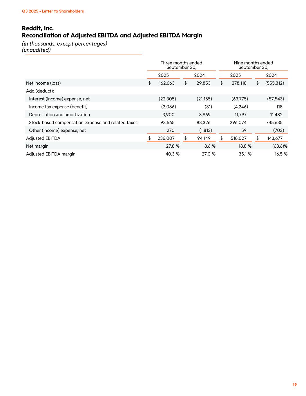 Reddit, Inc. Reconciliation of Adjusted EBITDA and Adjusted EBITDA Margin (in thousands, except percentages) (unaudited) 19 Q3 2025 • Letter to Shareholders Three months ended September 30, Nine months ended September 30, 2025 2024 2025 2024 Net income (loss) $ 162,663 $ 29,853 $ 278,118 $ (555,312) Add (deduct): Interest (income) expense, net (22,305) (21,155) (63,775) (57,543) Income tax expense (benefit) (2,086) (31) (4,246) 118 Depreciation and amortization 3,900 3,969 11,797 11,482 Stock-based compensation expense and related taxes 93,565 83,326 296,074 745,635 Other (income) expense, net 270 (1,813) 59 (703) Adjusted EBITDA $ 236,007 $ 94,149 $ 518,027 $ 143,677 Net margin 27.8 % 8.6 % 18.8 % (63.6) % Adjusted EBITDA margin 40.3 % 27.0 % 35.1 % 16.5 %