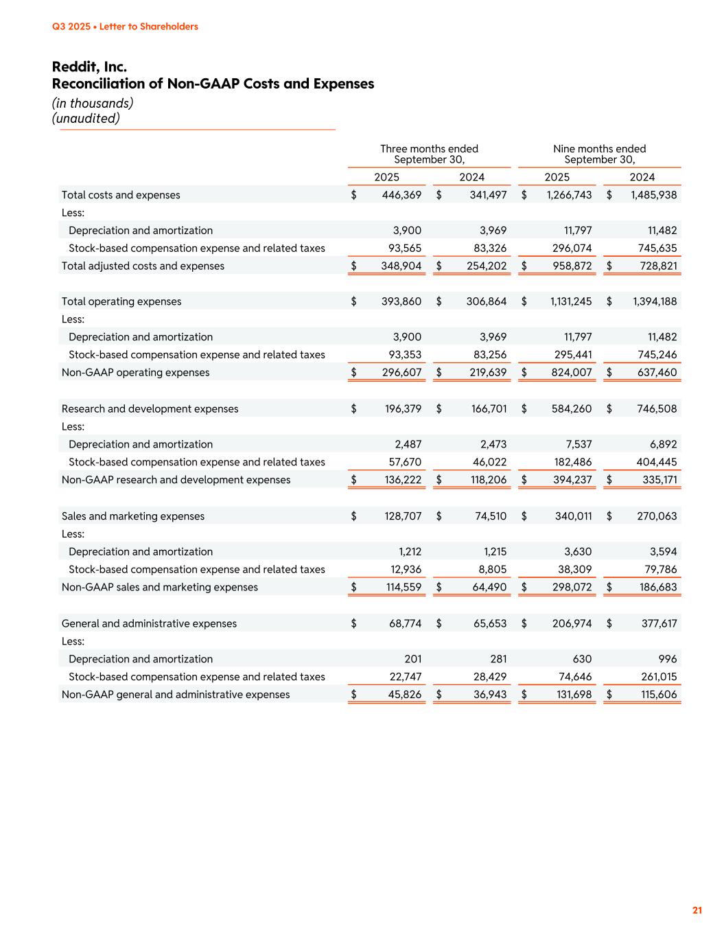 Reddit, Inc. Reconciliation of Non-GAAP Costs and Expenses (in thousands) (unaudited) 21 Q3 2025 • Letter to Shareholders Three months ended September 30, Nine months ended September 30, 2025 2024 2025 2024 Total costs and expenses $ 446,369 $ 341,497 $ 1,266,743 $ 1,485,938 Less: Depreciation and amortization 3,900 3,969 11,797 11,482 Stock-based compensation expense and related taxes 93,565 83,326 296,074 745,635 Total adjusted costs and expenses $ 348,904 $ 254,202 $ 958,872 $ 728,821 Total operating expenses $ 393,860 $ 306,864 $ 1,131,245 $ 1,394,188 Less: Depreciation and amortization 3,900 3,969 11,797 11,482 Stock-based compensation expense and related taxes 93,353 83,256 295,441 745,246 Non-GAAP operating expenses $ 296,607 $ 219,639 $ 824,007 $ 637,460 Research and development expenses $ 196,379 $ 166,701 $ 584,260 $ 746,508 Less: Depreciation and amortization 2,487 2,473 7,537 6,892 Stock-based compensation expense and related taxes 57,670 46,022 182,486 404,445 Non-GAAP research and development expenses $ 136,222 $ 118,206 $ 394,237 $ 335,171 Sales and marketing expenses $ 128,707 $ 74,510 $ 340,011 $ 270,063 Less: Depreciation and amortization 1,212 1,215 3,630 3,594 Stock-based compensation expense and related taxes 12,936 8,805 38,309 79,786 Non-GAAP sales and marketing expenses $ 114,559 $ 64,490 $ 298,072 $ 186,683 General and administrative expenses $ 68,774 $ 65,653 $ 206,974 $ 377,617 Less: Depreciation and amortization 201 281 630 996 Stock-based compensation expense and related taxes 22,747 28,429 74,646 261,015 Non-GAAP general and administrative expenses $ 45,826 $ 36,943 $ 131,698 $ 115,606