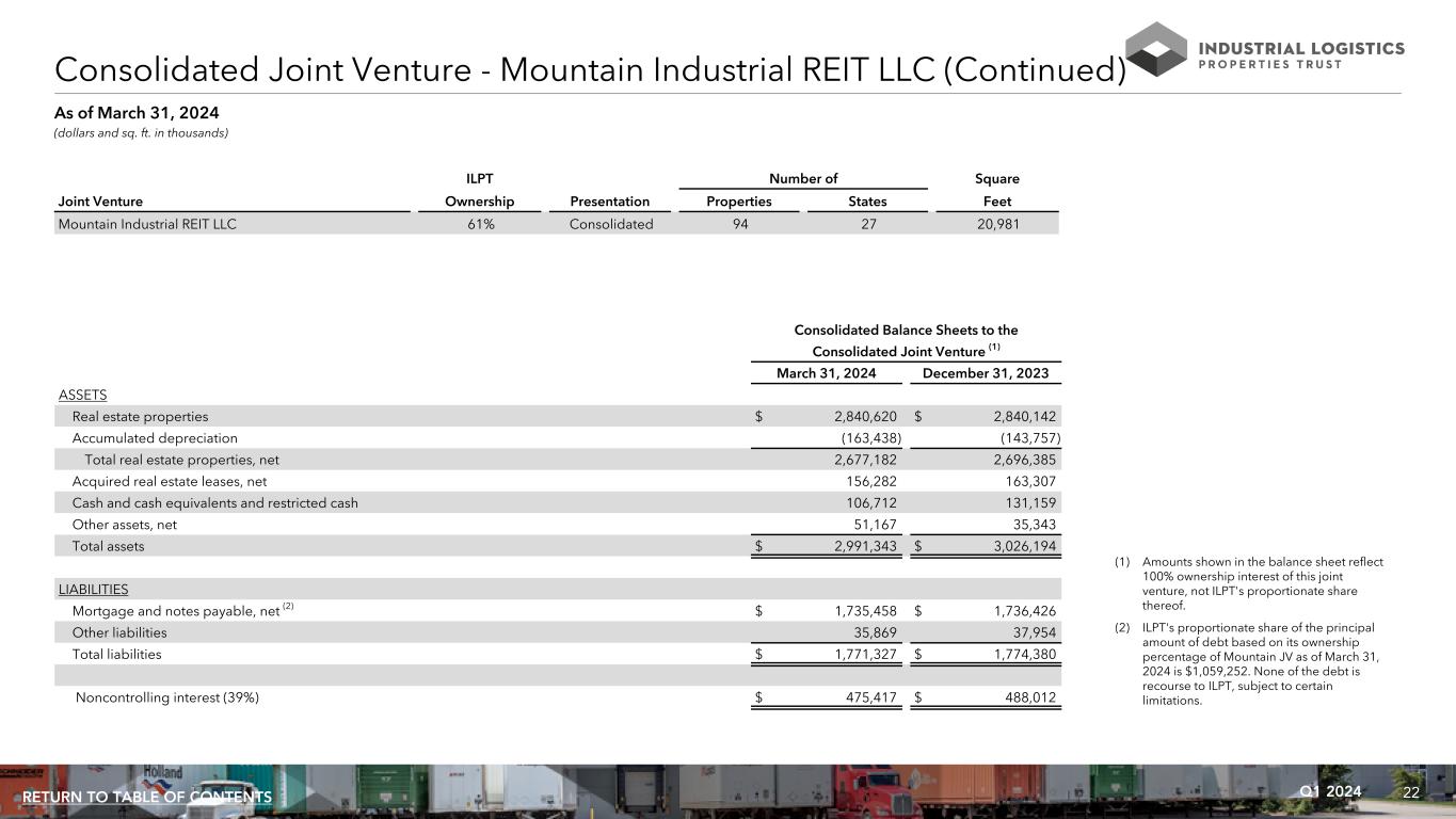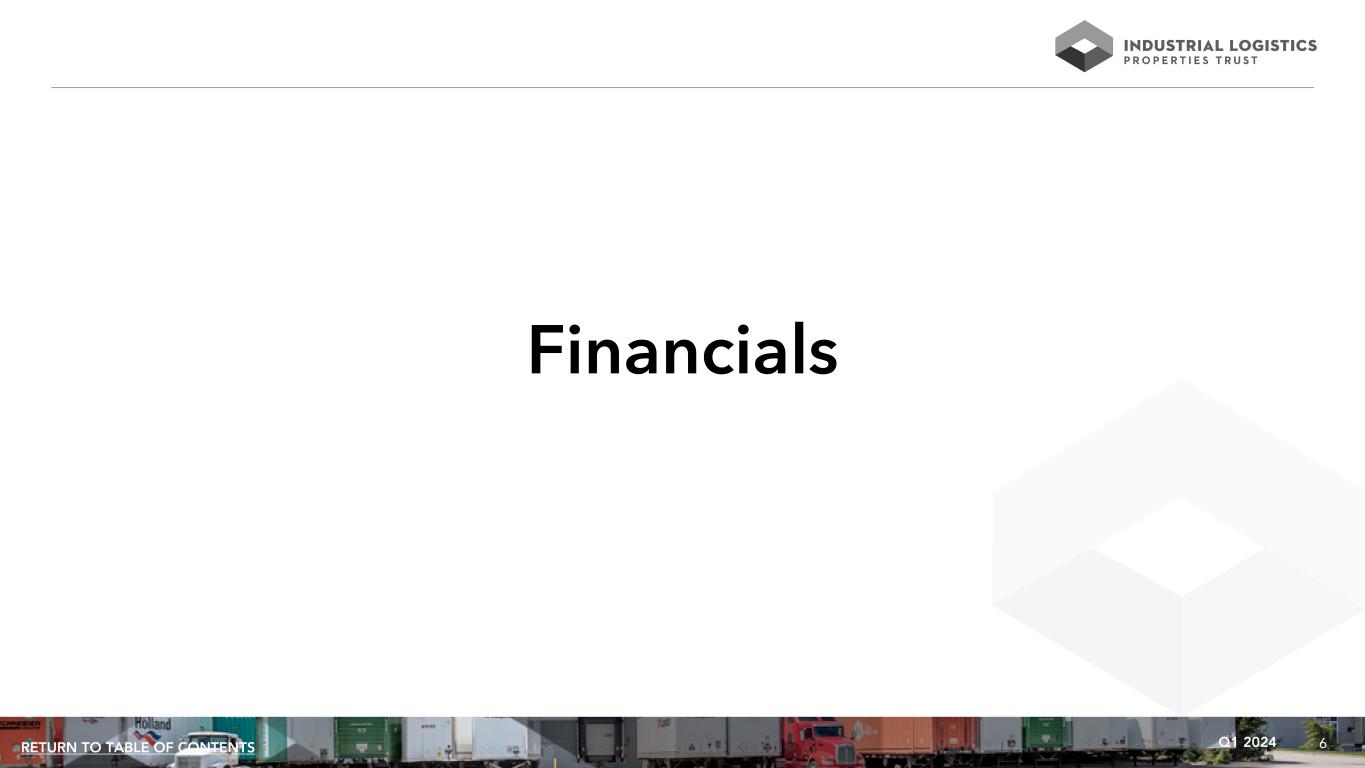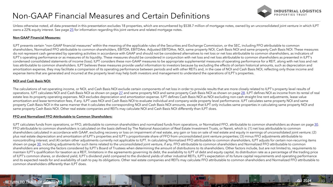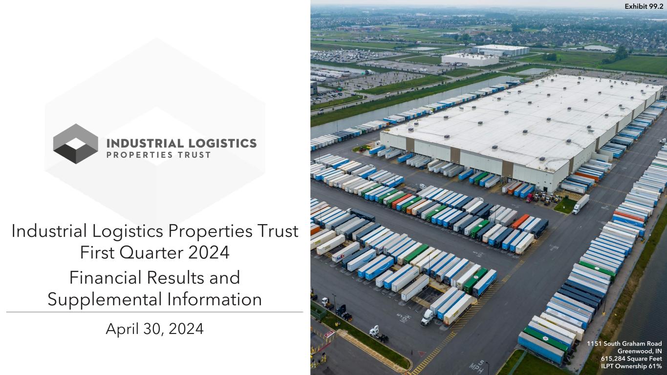 2Q1 2024RETURN TO TABLE OF CONTENTS QUARTERLY RESULTS Industrial Logistics Properties Trust Announces First Quarter 2024 Financial Results ..................................................... 4 First Quarter 2024 Highlights ........................................................................................................................... 5 FINANCIALS Key Financial Data ............................................................................................................................................................................................... 7 Condensed Consolidated Statements of Income (Loss) .............................................................................................................................. 8 Condensed Consolidated Balance Sheets ..................................................................................................................................................... 9 Debt Summary .................................................................................................................................................................................................... 10 Debt Maturity Schedule ...................................................................................................................................................................................... 11 Leverage and Coverage Ratios ......................................................................................................................................................................... 12 Capital Expenditures Summary ......................................................................................................................................................................... 13 PORTFOLIO INFORMATION Same Property Results ........................................................................................................................................................................................ 15 Occupancy and Leasing Summary ................................................................................................................................................................... 16 Tenant Credit Characteristics and Concentration ......................................................................................................................................... 17 Portfolio Lease Expiration and Reset Schedules ........................................................................................................................................... 18 Key Financial Data by Investment Portfolio .................................................................................................................................................... 19 JOINT VENTURES Consolidated Joint Venture - Mountain Industrial REIT LLC ....................................................................................................................... 21 - 24 Unconsolidated Joint Venture - The Industrial Fund REIT LLC ................................................................................................................... 25 APPENDIX Calculation and Reconciliation of NOI and Cash Basis NOI ........................................................................................................................ 27 Reconciliation of NOI to Same Property NOI and Calculation of Same Property Cash Basis NOI ...................................................... 28 Calculation of EBITDA, EBITDAre and Adjusted EBITDAre ......................................................................................................................... 29 Calculation of FFO, Normalized FFO and CAD ............................................................................................................................................. 30 - 31 Company Profile, Research Coverage and Governance Information ....................................................................................................... 32 Non-GAAP Financial Measures and Certain Definitions .............................................................................................................................. 33 - 35 WARNING CONCERNING FORWARD-LOOKING STATEMENTS 36 Table of Contents All amounts in this presentation are unaudited. Please refer to Non-GAAP Financial Measures and Certain Definitions for terms used throughout this document. Trading Symbols: Common Shares: ILPT Investor Relations Contact Kevin Brady, Director (617) 231-3017 kevin.brady@ilptreit.com Corporate Headquarters Two Newton Place 255 Washington Street, Suite 300 Newton, Massachusetts 02458-1634