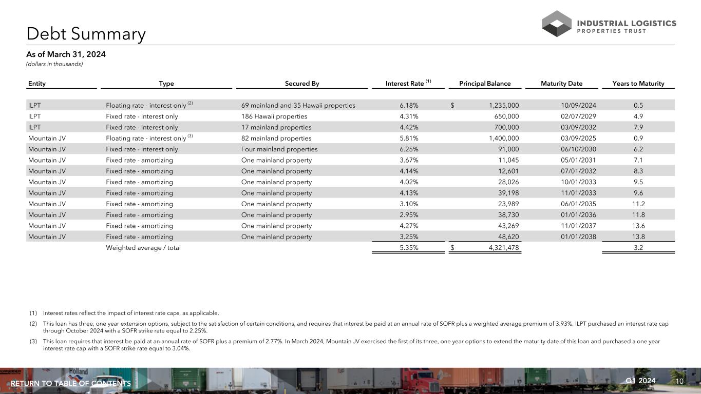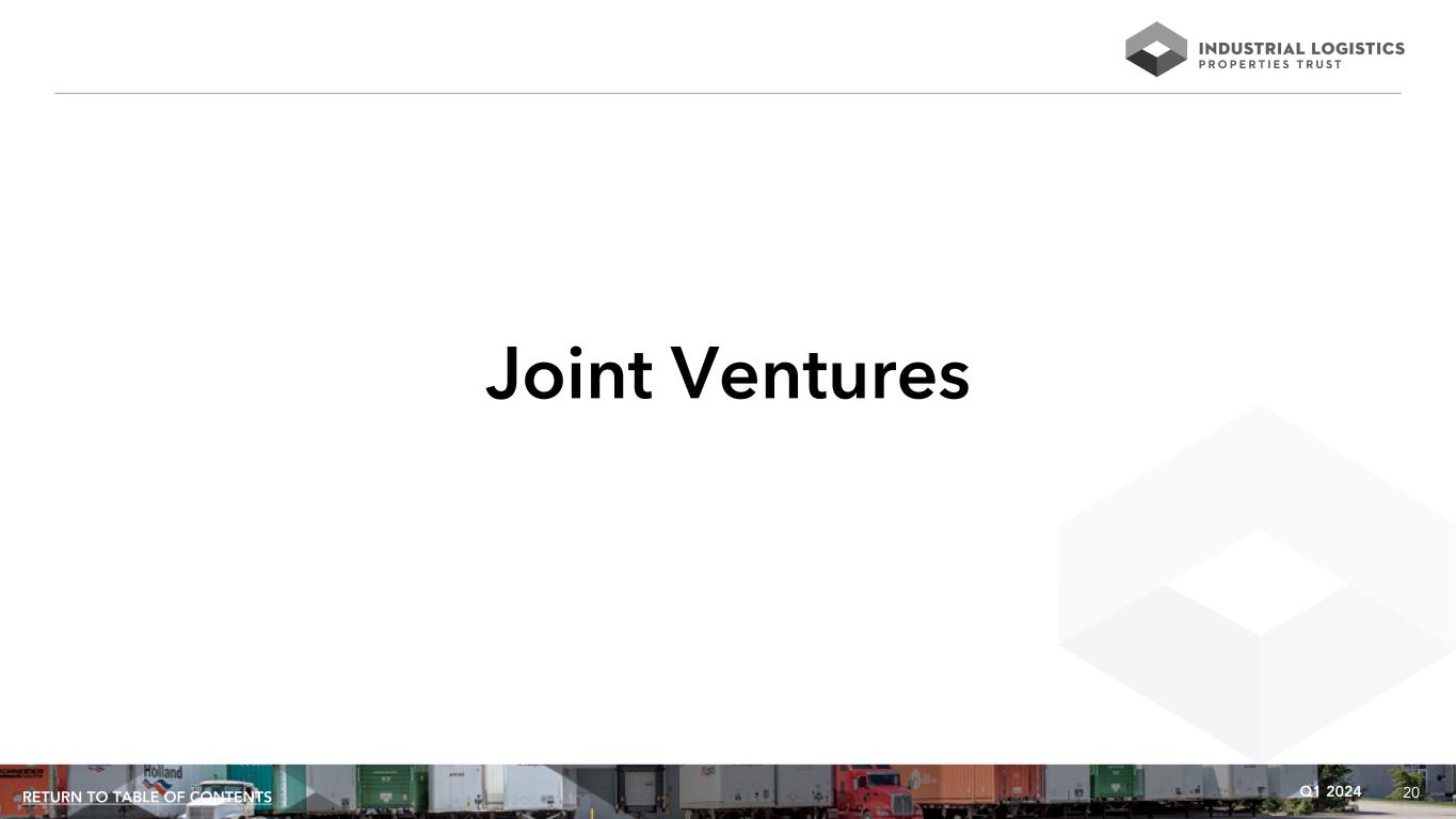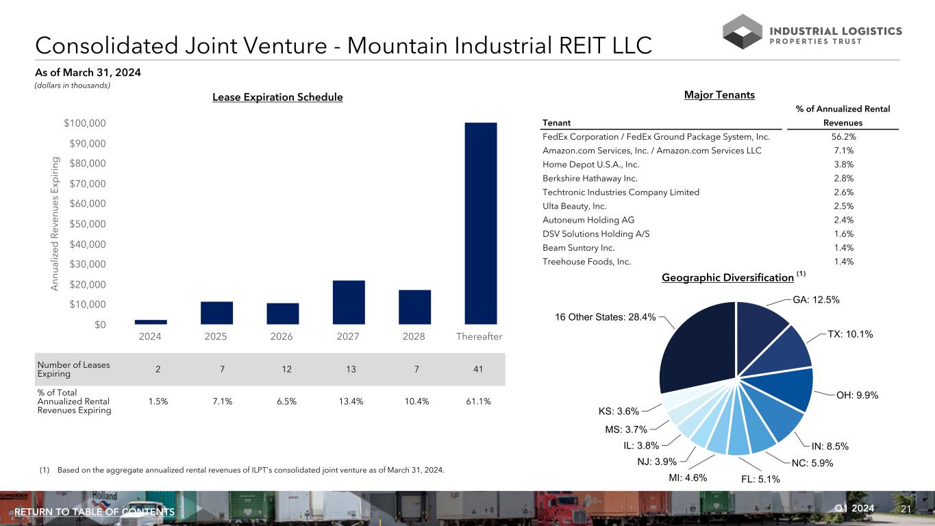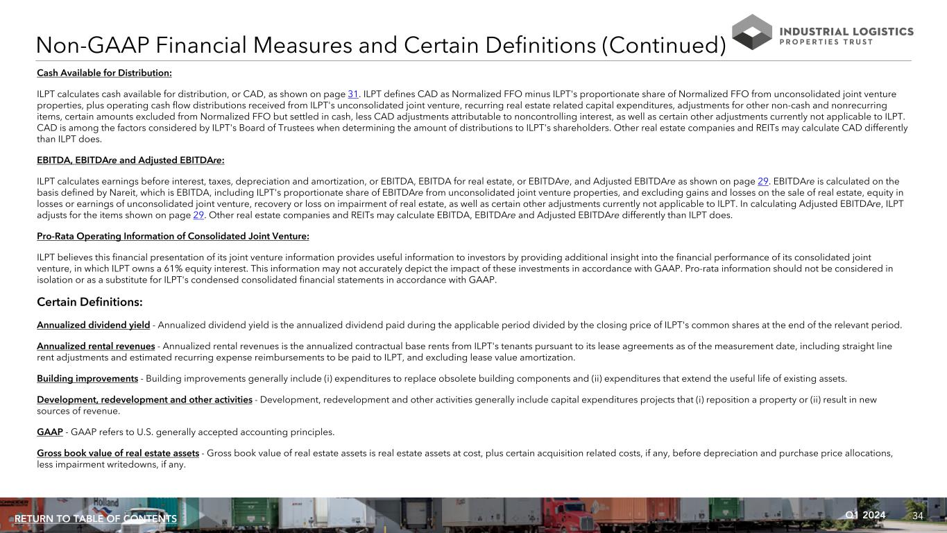 2Q1 2024RETURN TO TABLE OF CONTENTS QUARTERLY RESULTS Industrial Logistics Properties Trust Announces First Quarter 2024 Financial Results ..................................................... 4 First Quarter 2024 Highlights ........................................................................................................................... 5 FINANCIALS Key Financial Data ............................................................................................................................................................................................... 7 Condensed Consolidated Statements of Income (Loss) .............................................................................................................................. 8 Condensed Consolidated Balance Sheets ..................................................................................................................................................... 9 Debt Summary .................................................................................................................................................................................................... 10 Debt Maturity Schedule ...................................................................................................................................................................................... 11 Leverage and Coverage Ratios ......................................................................................................................................................................... 12 Capital Expenditures Summary ......................................................................................................................................................................... 13 PORTFOLIO INFORMATION Same Property Results ........................................................................................................................................................................................ 15 Occupancy and Leasing Summary ................................................................................................................................................................... 16 Tenant Credit Characteristics and Concentration ......................................................................................................................................... 17 Portfolio Lease Expiration and Reset Schedules ........................................................................................................................................... 18 Key Financial Data by Investment Portfolio .................................................................................................................................................... 19 JOINT VENTURES Consolidated Joint Venture - Mountain Industrial REIT LLC ....................................................................................................................... 21 - 24 Unconsolidated Joint Venture - The Industrial Fund REIT LLC ................................................................................................................... 25 APPENDIX Calculation and Reconciliation of NOI and Cash Basis NOI ........................................................................................................................ 27 Reconciliation of NOI to Same Property NOI and Calculation of Same Property Cash Basis NOI ...................................................... 28 Calculation of EBITDA, EBITDAre and Adjusted EBITDAre ......................................................................................................................... 29 Calculation of FFO, Normalized FFO and CAD ............................................................................................................................................. 30 - 31 Company Profile, Research Coverage and Governance Information ....................................................................................................... 32 Non-GAAP Financial Measures and Certain Definitions .............................................................................................................................. 33 - 35 WARNING CONCERNING FORWARD-LOOKING STATEMENTS 36 Table of Contents All amounts in this presentation are unaudited. Please refer to Non-GAAP Financial Measures and Certain Definitions for terms used throughout this document. Trading Symbols: Common Shares: ILPT Investor Relations Contact Kevin Brady, Director (617) 231-3017 kevin.brady@ilptreit.com Corporate Headquarters Two Newton Place 255 Washington Street, Suite 300 Newton, Massachusetts 02458-1634