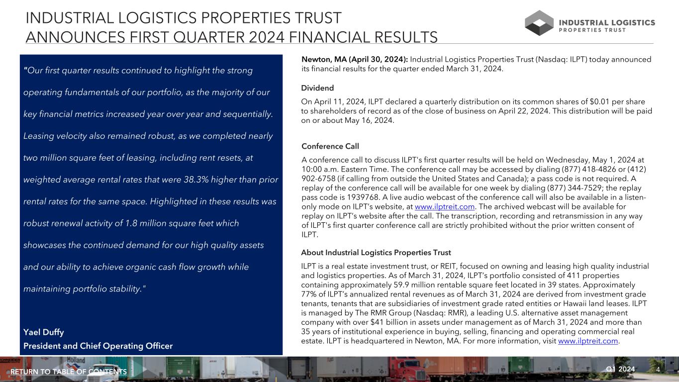 4Q1 2024RETURN TO TABLE OF CONTENTS "Our first quarter results continued to highlight the strong operating fundamentals of our portfolio, as the majority of our key financial metrics increased year over year and sequentially. Leasing velocity also remained robust, as we completed nearly two million square feet of leasing, including rent resets, at weighted average rental rates that were 38.3% higher than prior rental rates for the same space. Highlighted in these results was robust renewal activity of 1.8 million square feet which showcases the continued demand for our high quality assets and our ability to achieve organic cash flow growth while maintaining portfolio stability." Yael Duffy President and Chief Operating Officer INDUSTRIAL LOGISTICS PROPERTIES TRUST ANNOUNCES FIRST QUARTER 2024 FINANCIAL RESULTS Newton, MA (April 30, 2024): Industrial Logistics Properties Trust (Nasdaq: ILPT) today announced its financial results for the quarter ended March 31, 2024. Dividend On April 11, 2024, ILPT declared a quarterly distribution on its common shares of $0.01 per share to shareholders of record as of the close of business on April 22, 2024. This distribution will be paid on or about May 16, 2024. Conference Call A conference call to discuss ILPT's first quarter results will be held on Wednesday, May 1, 2024 at 10:00 a.m. Eastern Time. The conference call may be accessed by dialing (877) 418-4826 or (412) 902-6758 (if calling from outside the United States and Canada); a pass code is not required. A replay of the conference call will be available for one week by dialing (877) 344-7529; the replay pass code is 1939768. A live audio webcast of the conference call will also be available in a listen- only mode on ILPT’s website, at www.ilptreit.com. The archived webcast will be available for replay on ILPT’s website after the call. The transcription, recording and retransmission in any way of ILPT's first quarter conference call are strictly prohibited without the prior written consent of ILPT. About Industrial Logistics Properties Trust ILPT is a real estate investment trust, or REIT, focused on owning and leasing high quality industrial and logistics properties. As of March 31, 2024, ILPT’s portfolio consisted of 411 properties containing approximately 59.9 million rentable square feet located in 39 states. Approximately 77% of ILPT’s annualized rental revenues as of March 31, 2024 are derived from investment grade tenants, tenants that are subsidiaries of investment grade rated entities or Hawaii land leases. ILPT is managed by The RMR Group (Nasdaq: RMR), a leading U.S. alternative asset management company with over $41 billion in assets under management as of March 31, 2024 and more than 35 years of institutional experience in buying, selling, financing and operating commercial real estate. ILPT is headquartered in Newton, MA. For more information, visit www.ilptreit.com.