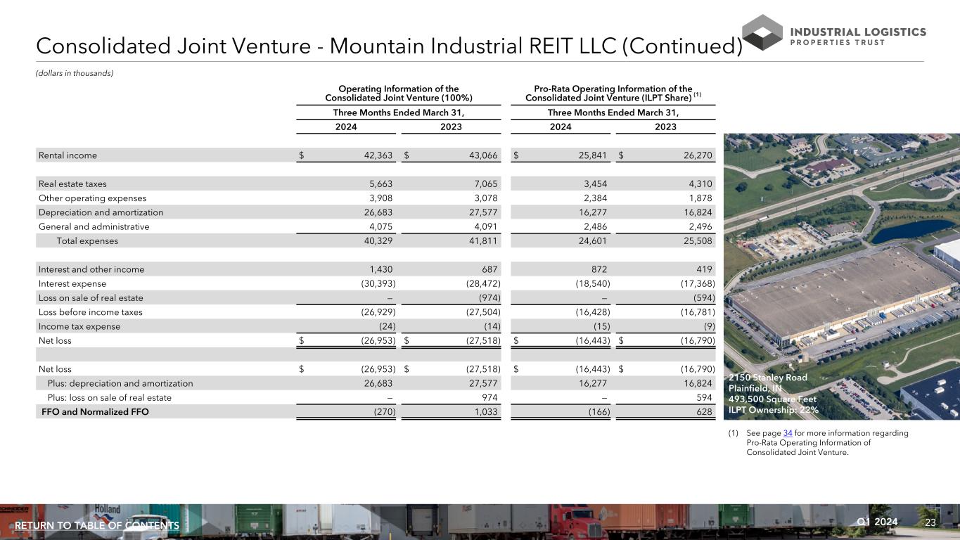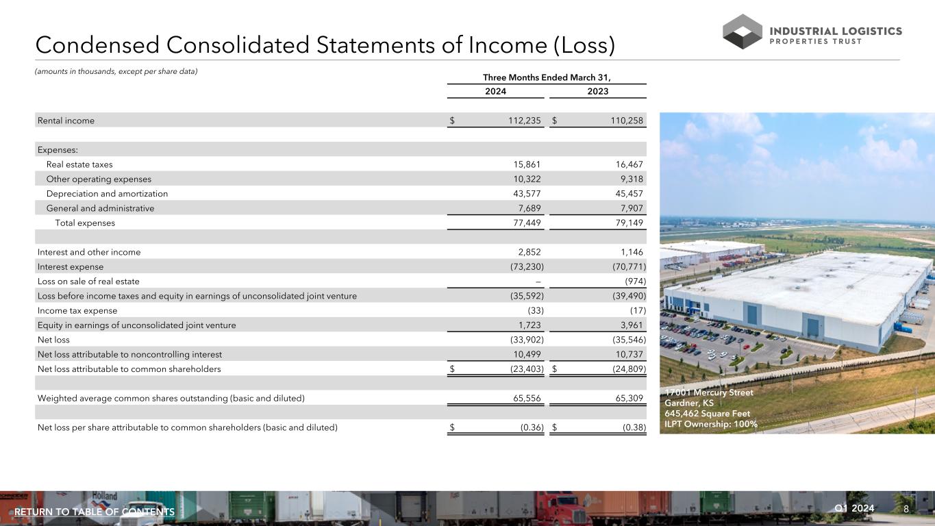 8Q1 2024RETURN TO TABLE OF CONTENTS Condensed Consolidated Statements of Income (Loss) Three Months Ended March 31, 2024 2023 Rental income $ 112,235 $ 110,258 Expenses: Real estate taxes 15,861 16,467 Other operating expenses 10,322 9,318 Depreciation and amortization 43,577 45,457 General and administrative 7,689 7,907 Total expenses 77,449 79,149 Interest and other income 2,852 1,146 Interest expense (73,230) (70,771) Loss on sale of real estate — (974) Loss before income taxes and equity in earnings of unconsolidated joint venture (35,592) (39,490) Income tax expense (33) (17) Equity in earnings of unconsolidated joint venture 1,723 3,961 Net loss (33,902) (35,546) Net loss attributable to noncontrolling interest 10,499 10,737 Net loss attributable to common shareholders $ (23,403) $ (24,809) Weighted average common shares outstanding (basic and diluted) 65,556 65,309 Net loss per share attributable to common shareholders (basic and diluted) $ (0.36) $ (0.38) (amounts in thousands, except per share data) 17001 Mercury Street Gardner, KS 645,462 Square Feet ILPT Ownership: 100%